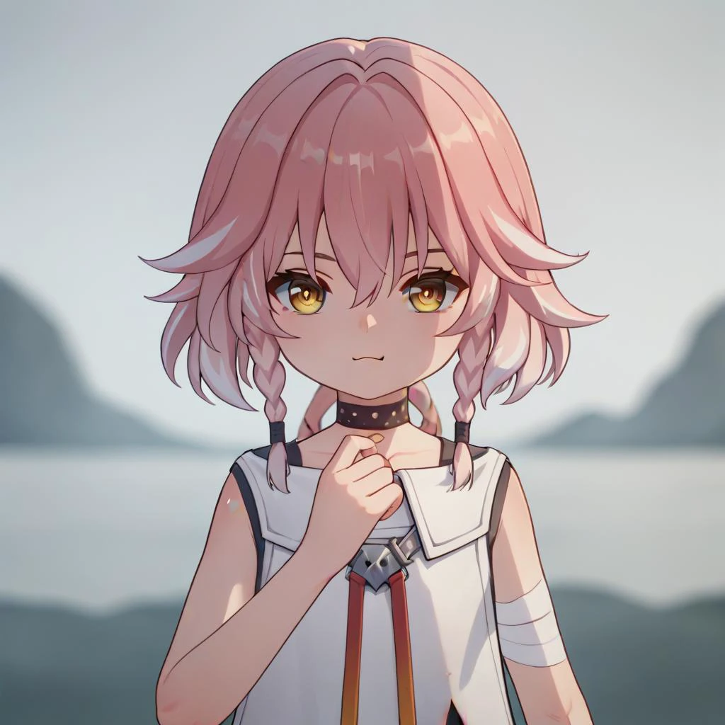 changli, pink hair, yellow eyes, braid, white dress, bandages