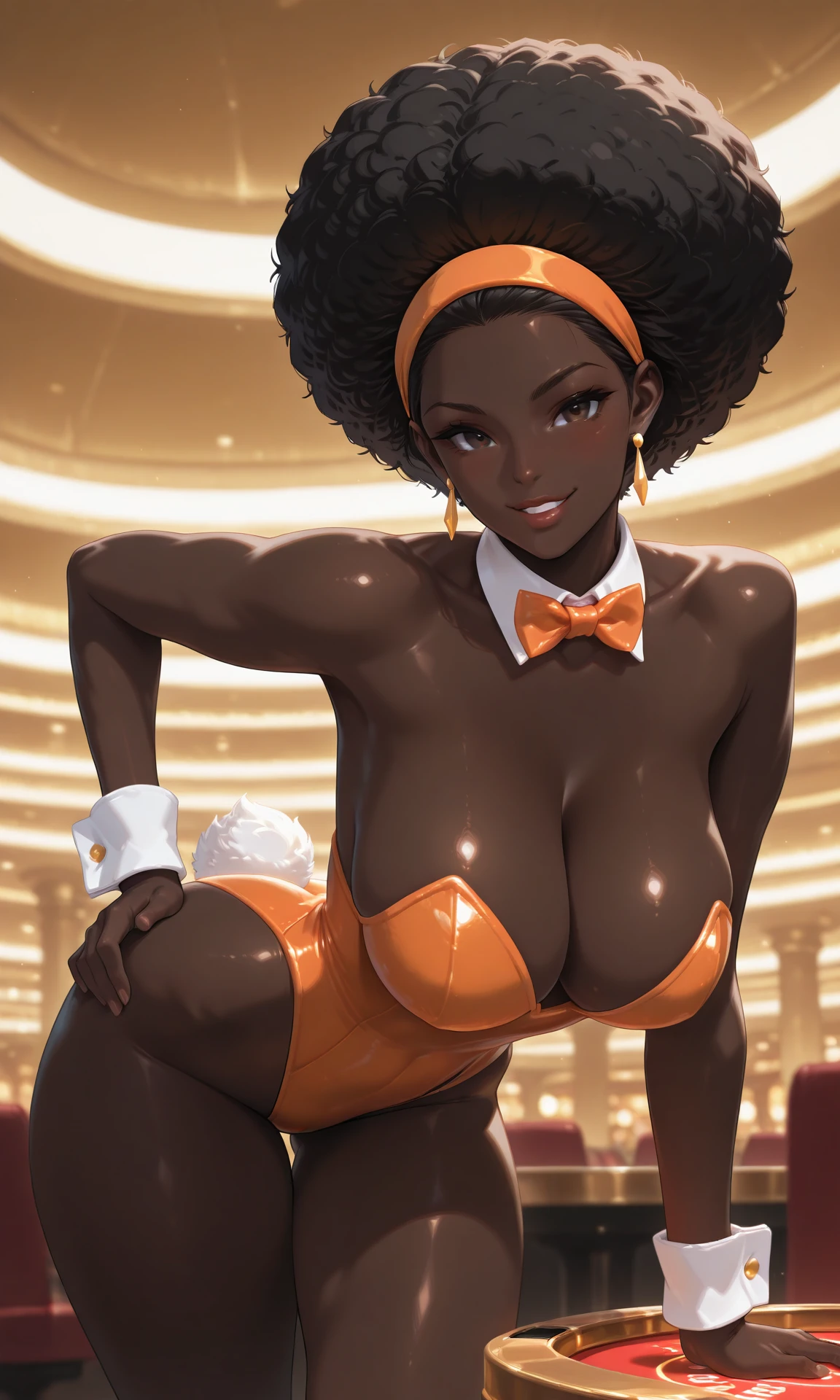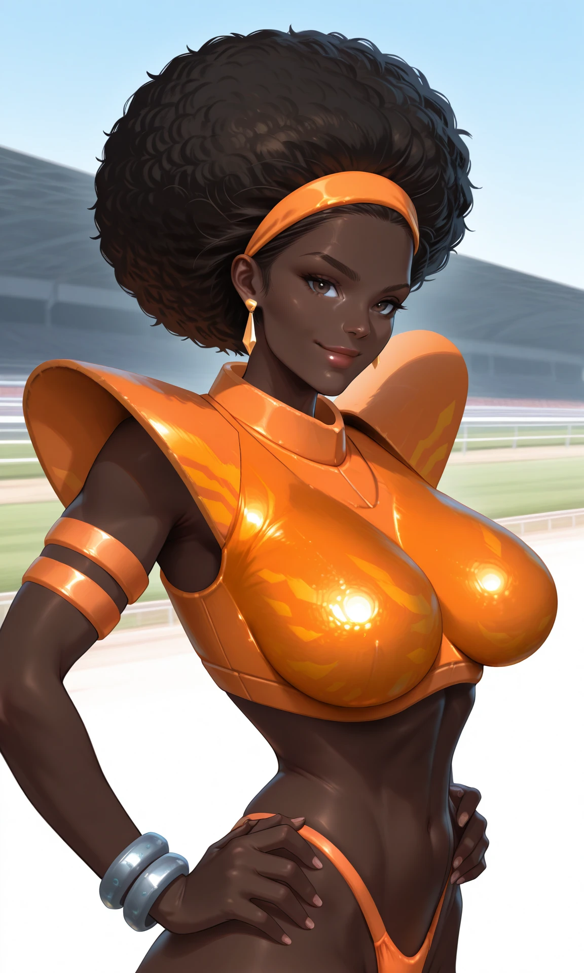 very dark skin, black hair, afro, brown eyes, lips, orange hairband, dangle earrings, orange armor, impossible armor, breastplate, shoulder armor, orange panties, orange armlet, silver bracelets, orange ankle boots