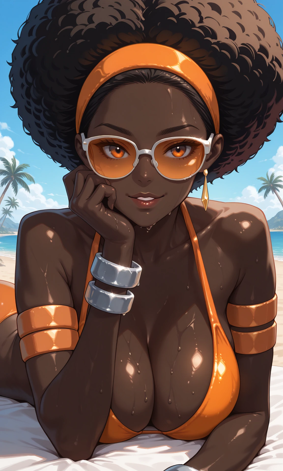 [Default Outfit]: very dark skin, black hair, afro, brown eyes, lips, orange hairband, dangle earrings, orange armor, impossible armor, breastplate, shoulder armor, orange panties, orange armlet, silver bracelets, orange ankle boots
