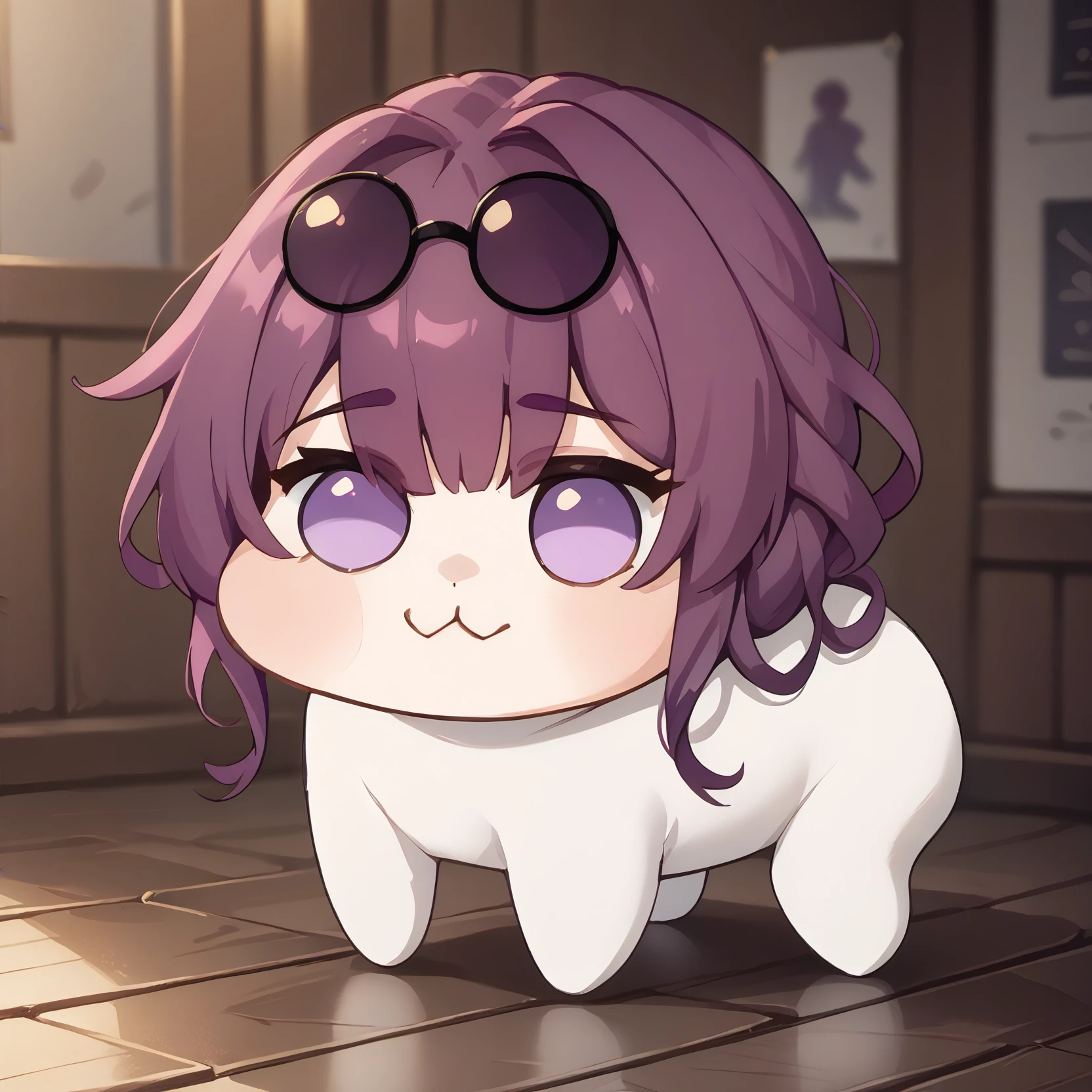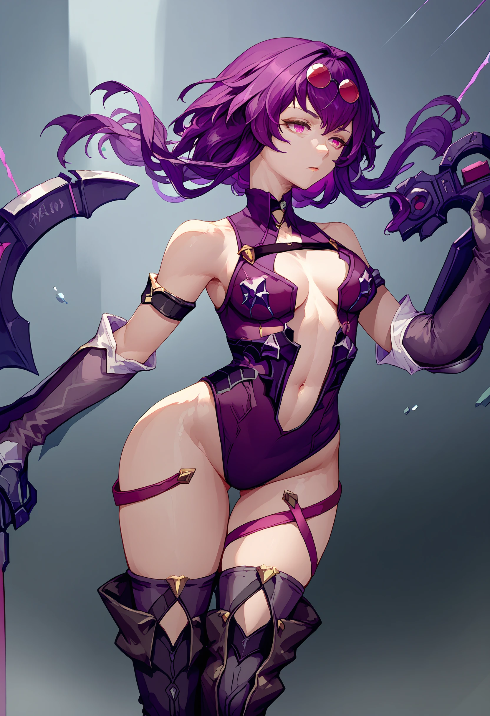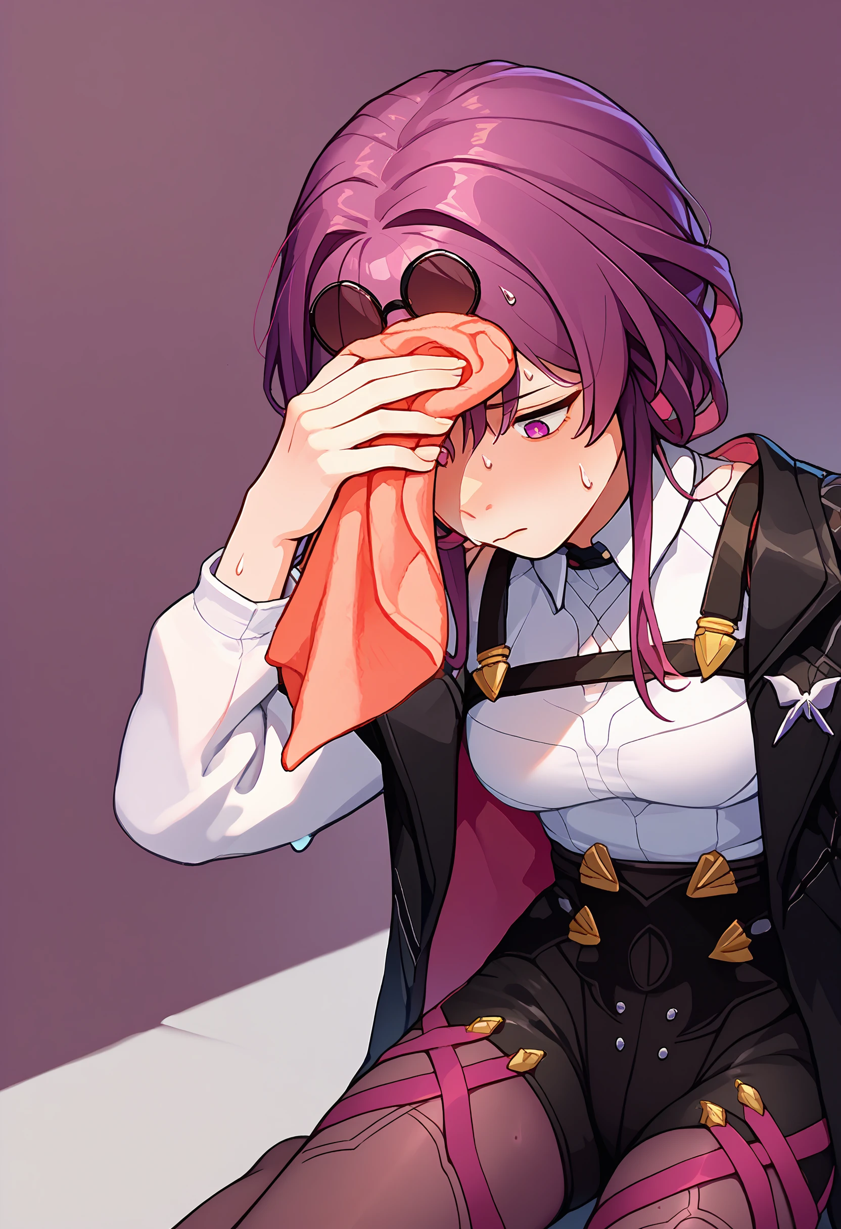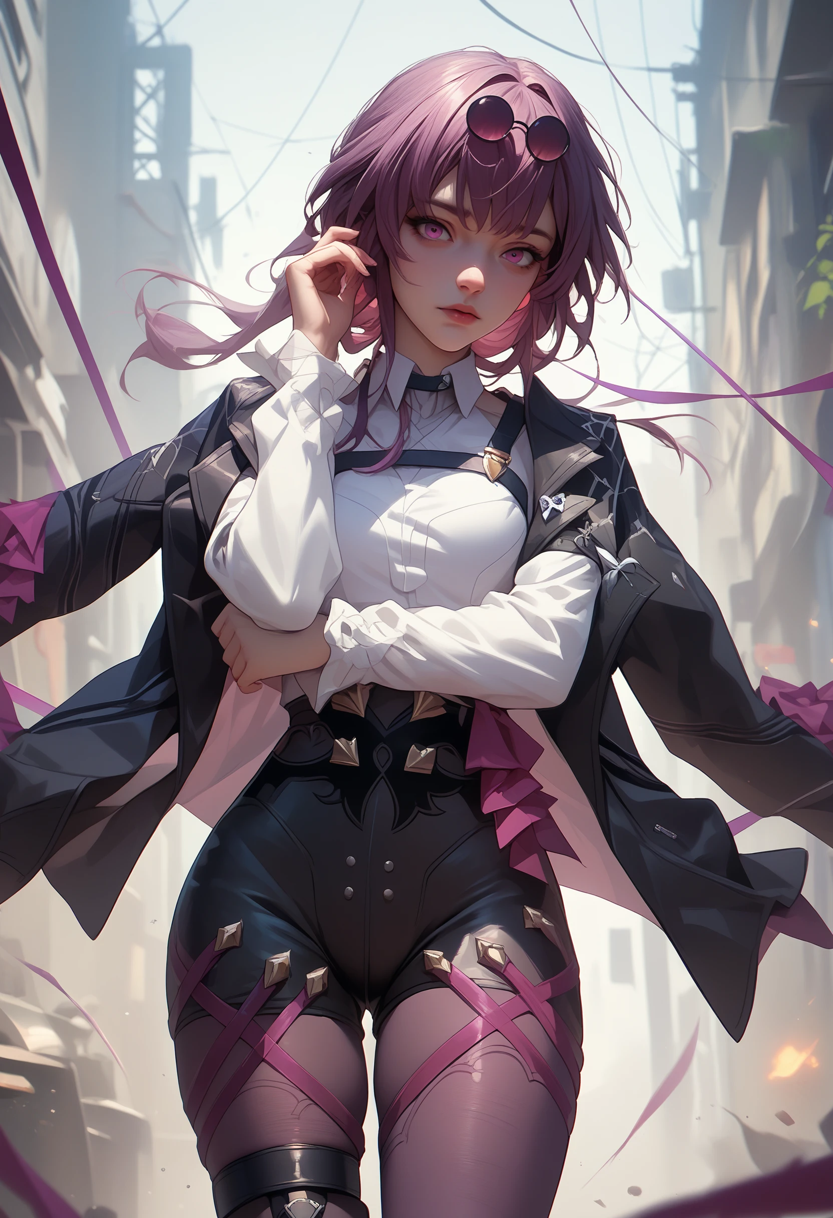 Outfit: eyewear on head, black jacket, white shirt, black shorts, purple pantyhose, boots