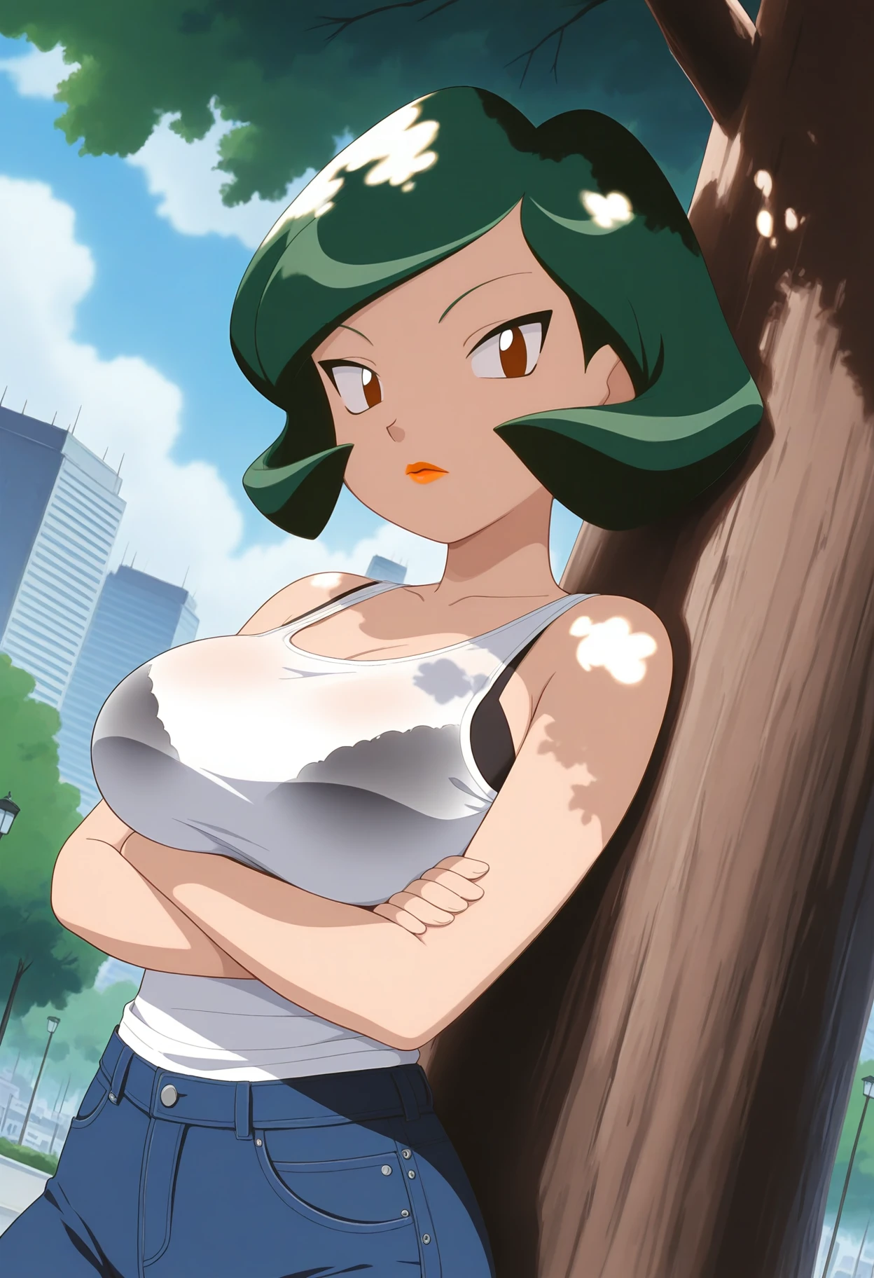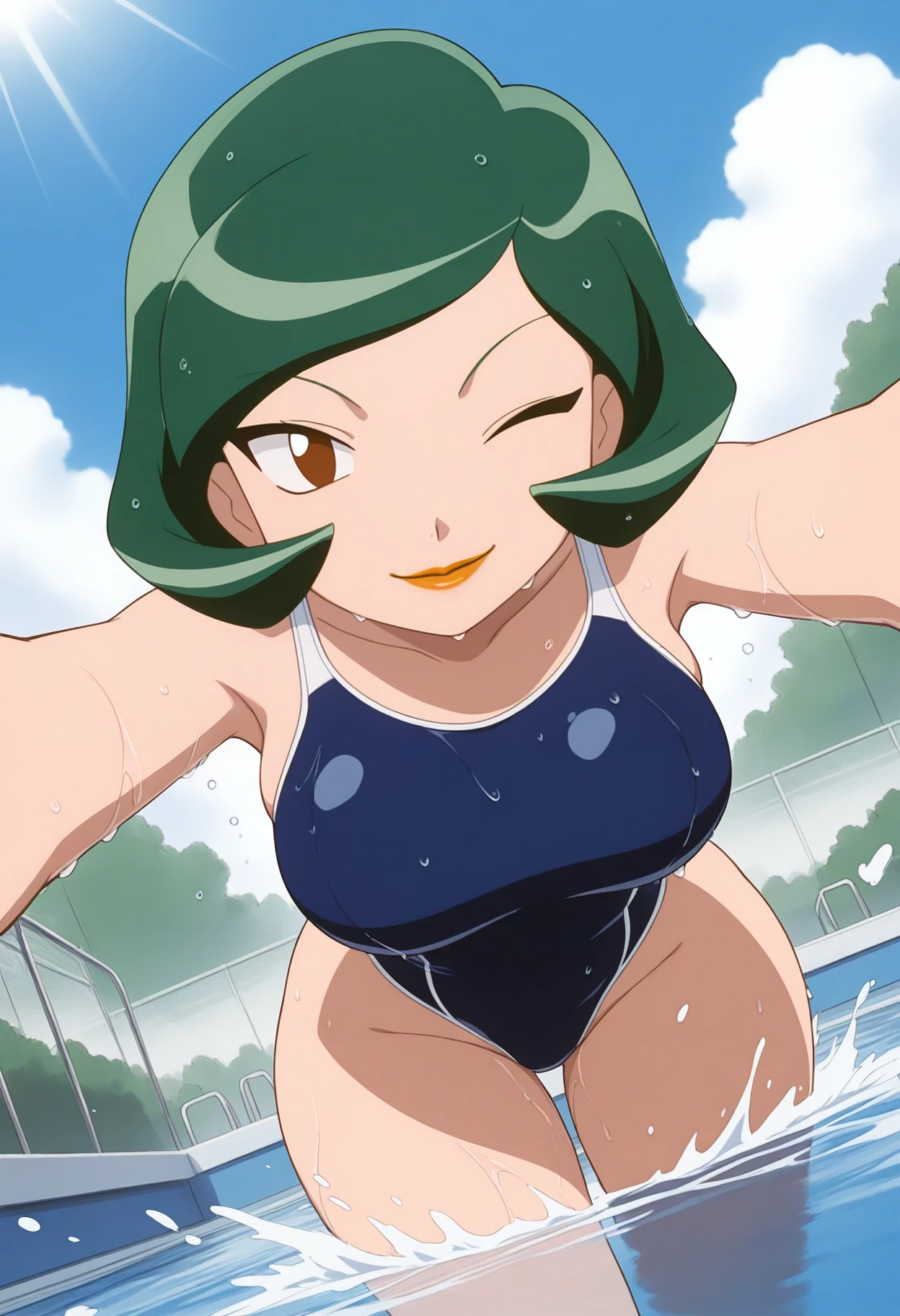 PMWndy, 1girl, green hair, short hair, brown eyes, lipstick, breasts,