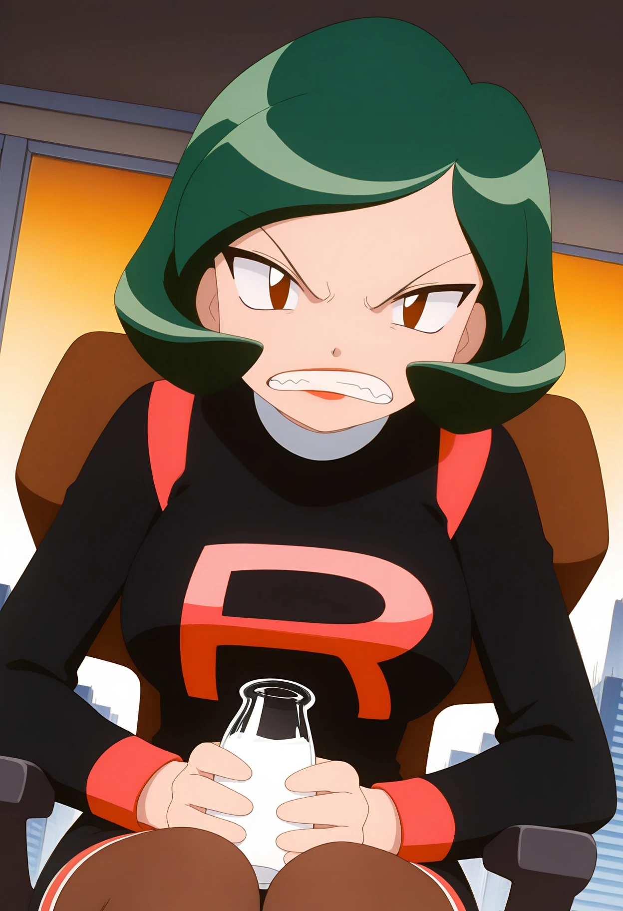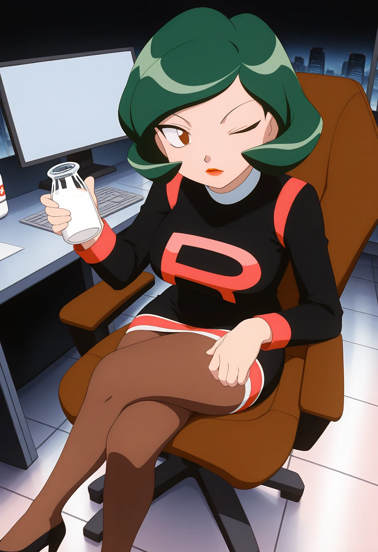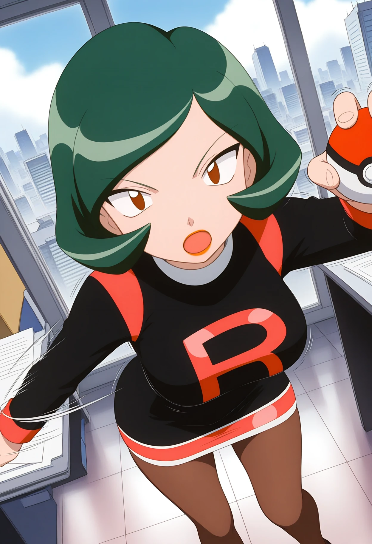 team rocket uniform, black short dress, long sleeves, brown pantyhose,