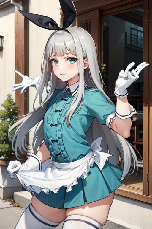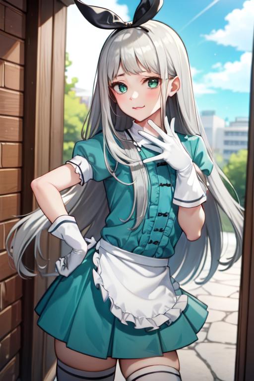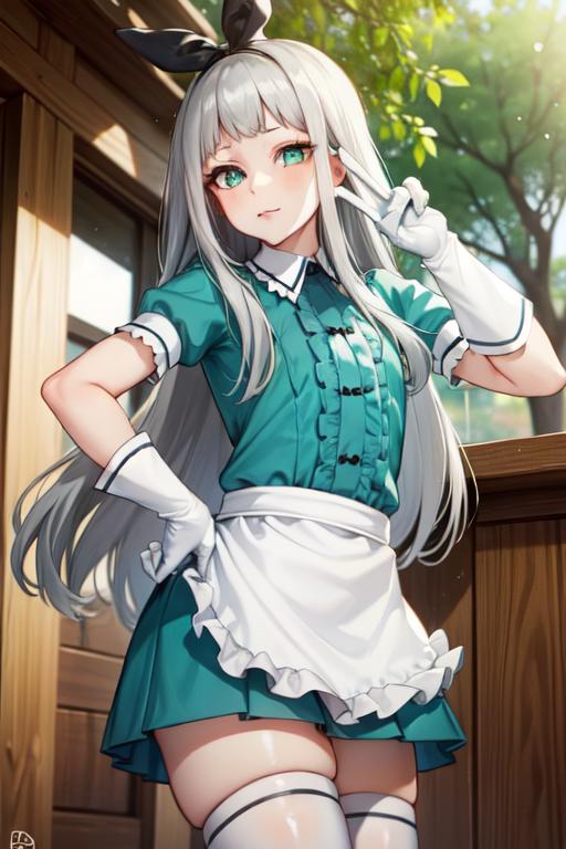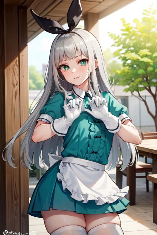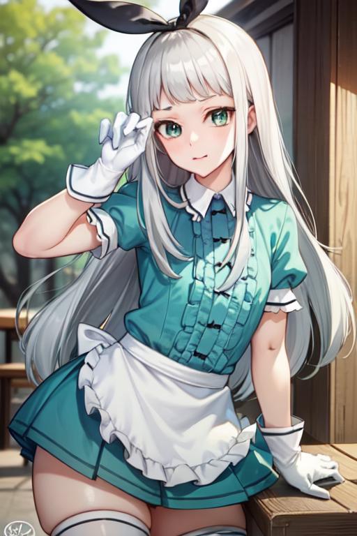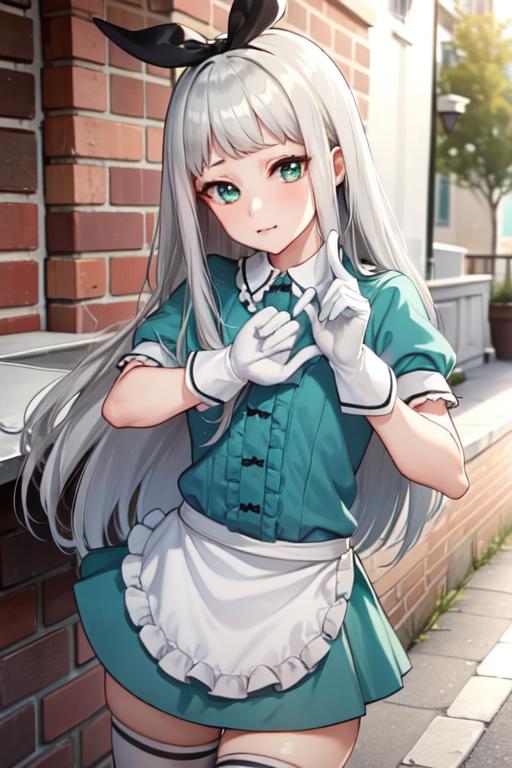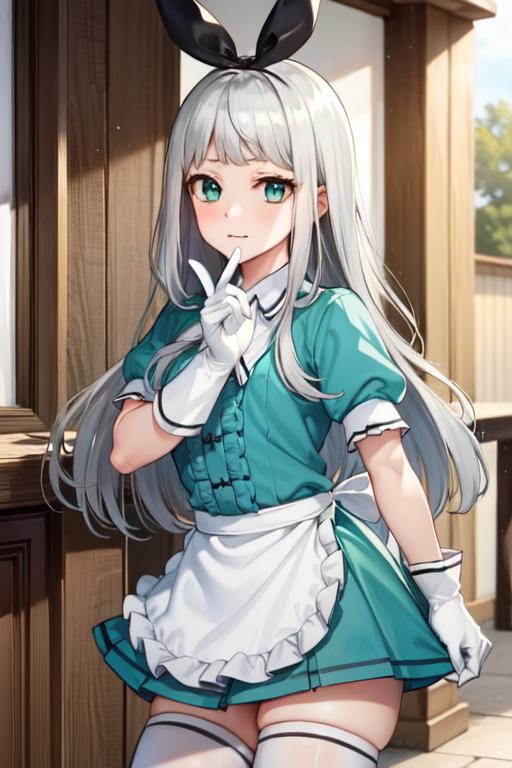green_eyes, apron, bow, gloves, long_hair, bangs, otoko_no_ko, silver_hair, stile_uniform, thighhighs, waist_apron, waitress, white_gloves, white_legwear