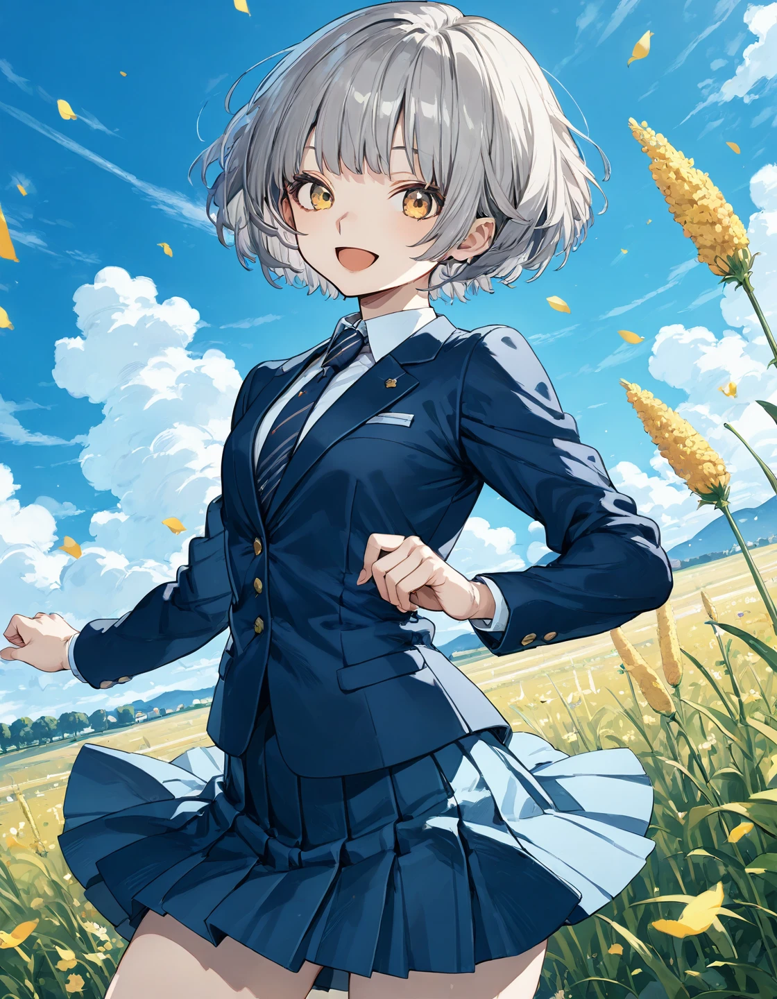 momoshiro_chiyoko, yellow eyes, grey hair, short hair, school uniform, blue blazer, necktie, pleated skirt, blue skirt,
