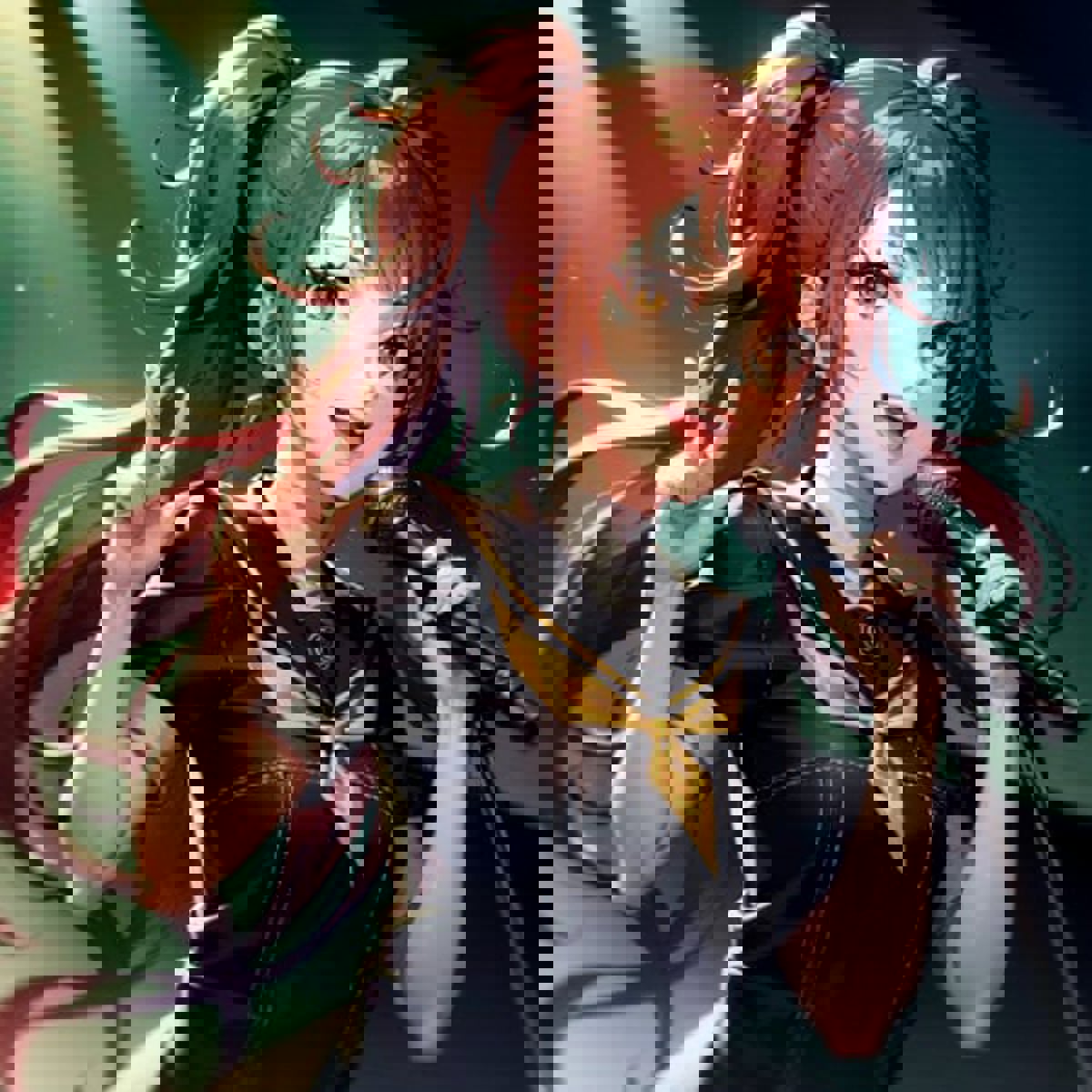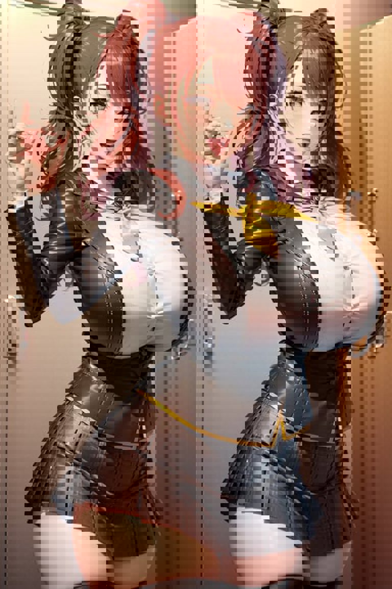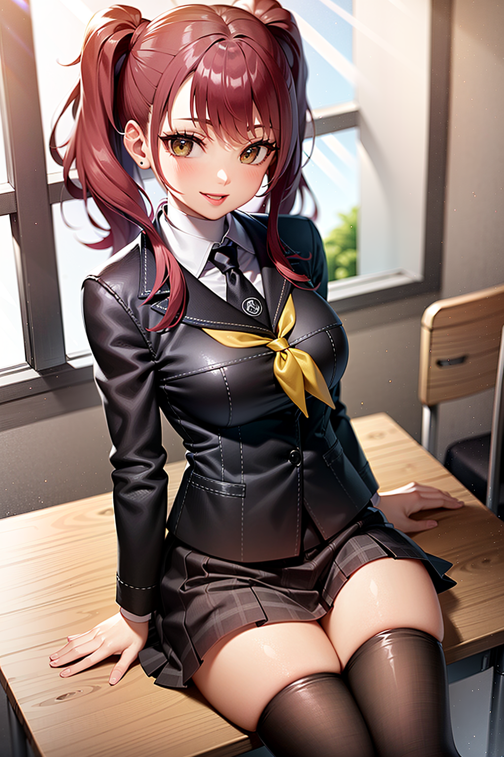 (yellow neckerchief,black plaid skirt,black blazer,black thigh highs,school uniform,:1.2)