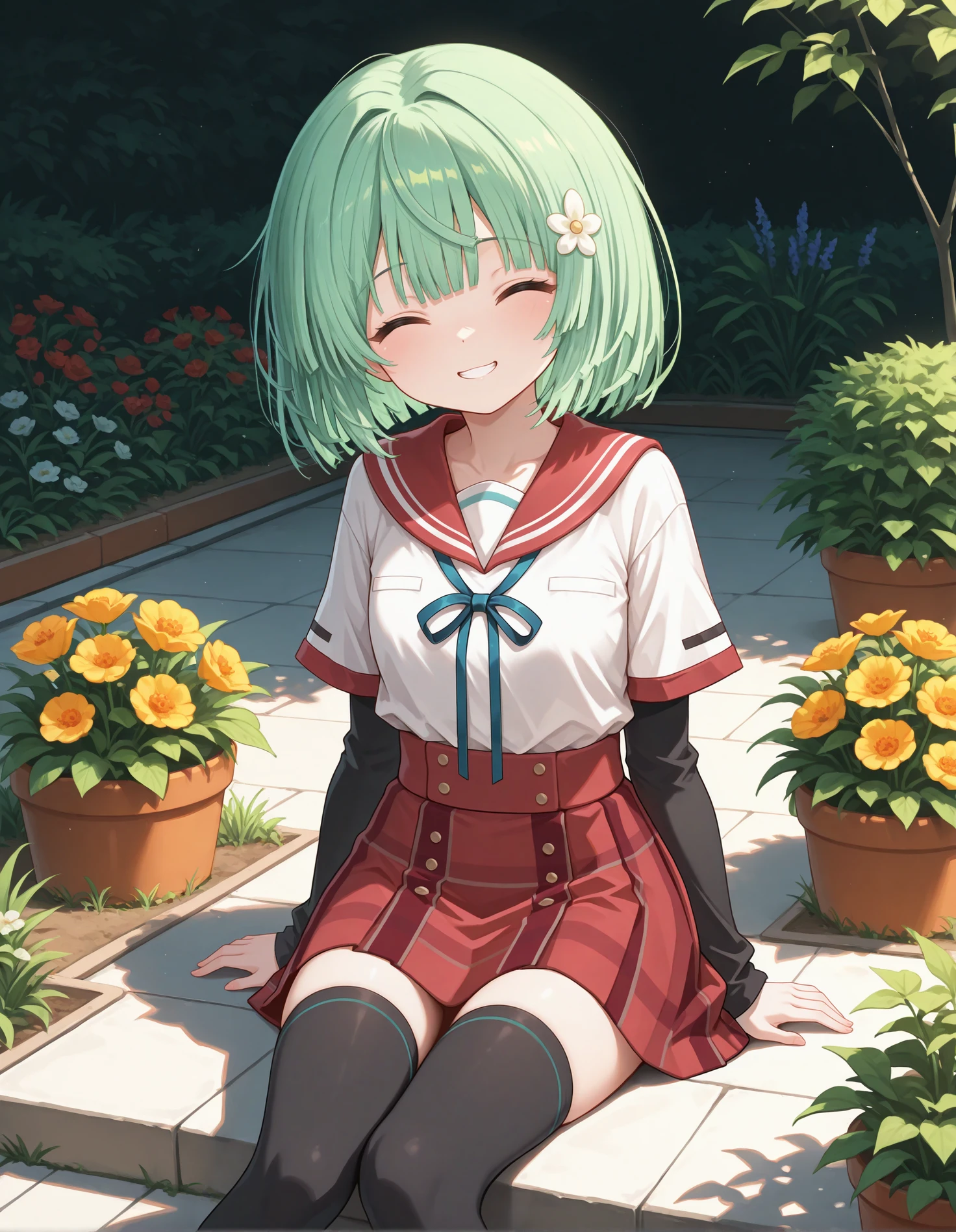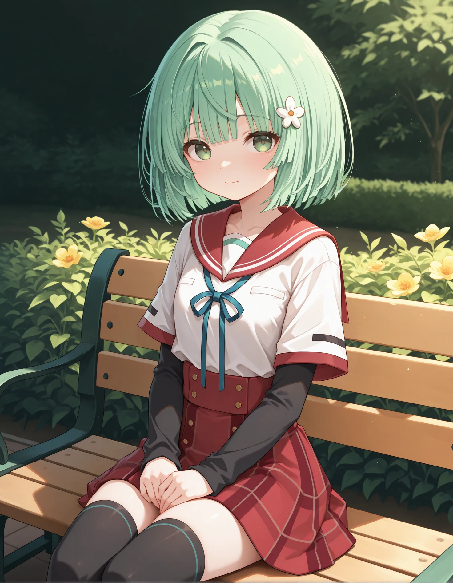 mgrckakonatsume, kakocsl, green hair, blunt bangs, green eyes, white hairpin, white shirt, red sailor collar, short over long sleeves, black sleeves, blue neck ribbon, red plaid skirt