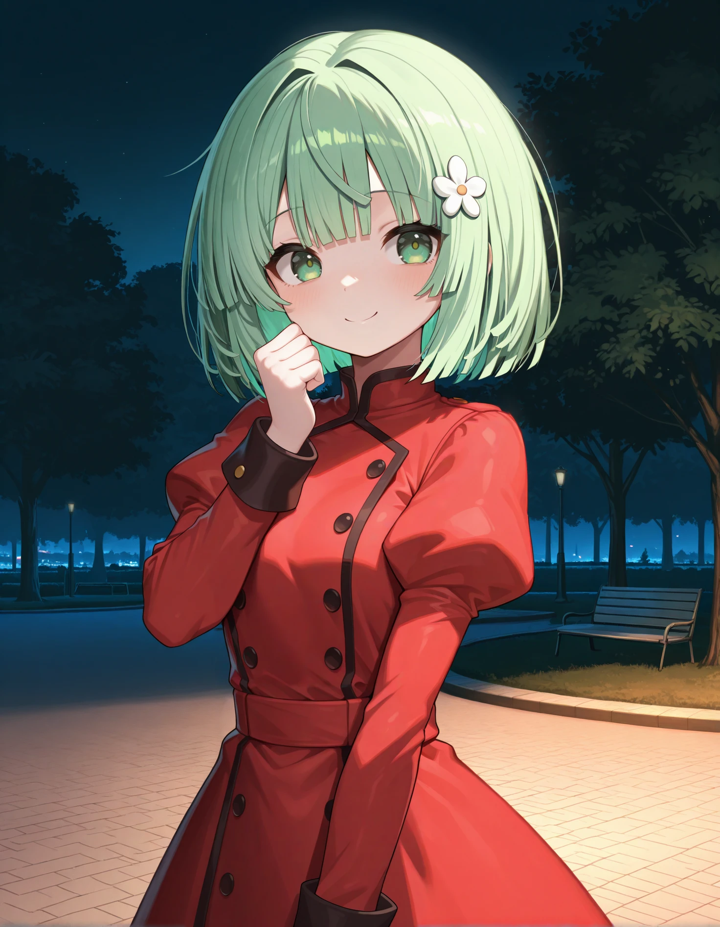 Appearance: green hair, blunt bangs, green eyes, white hairpin