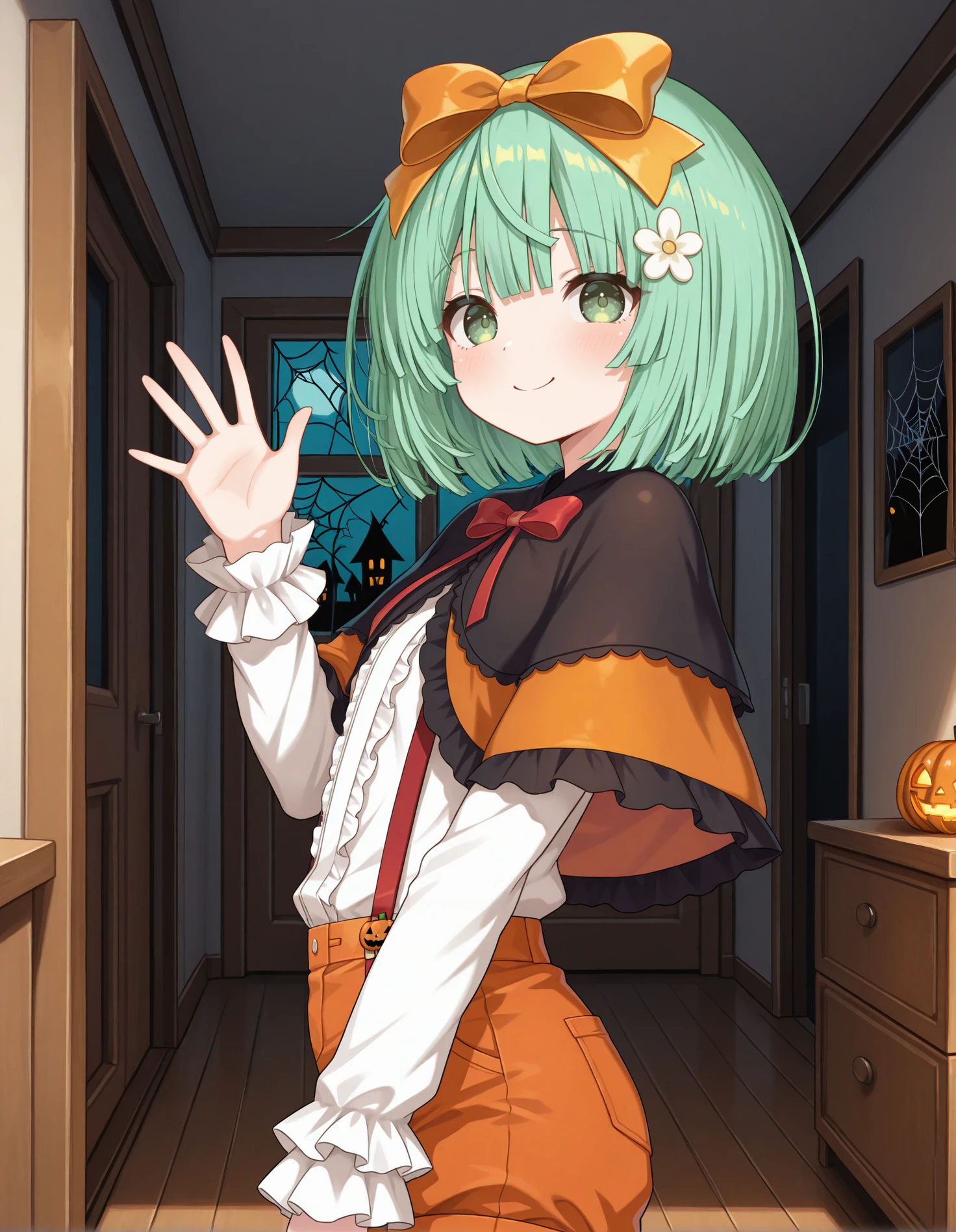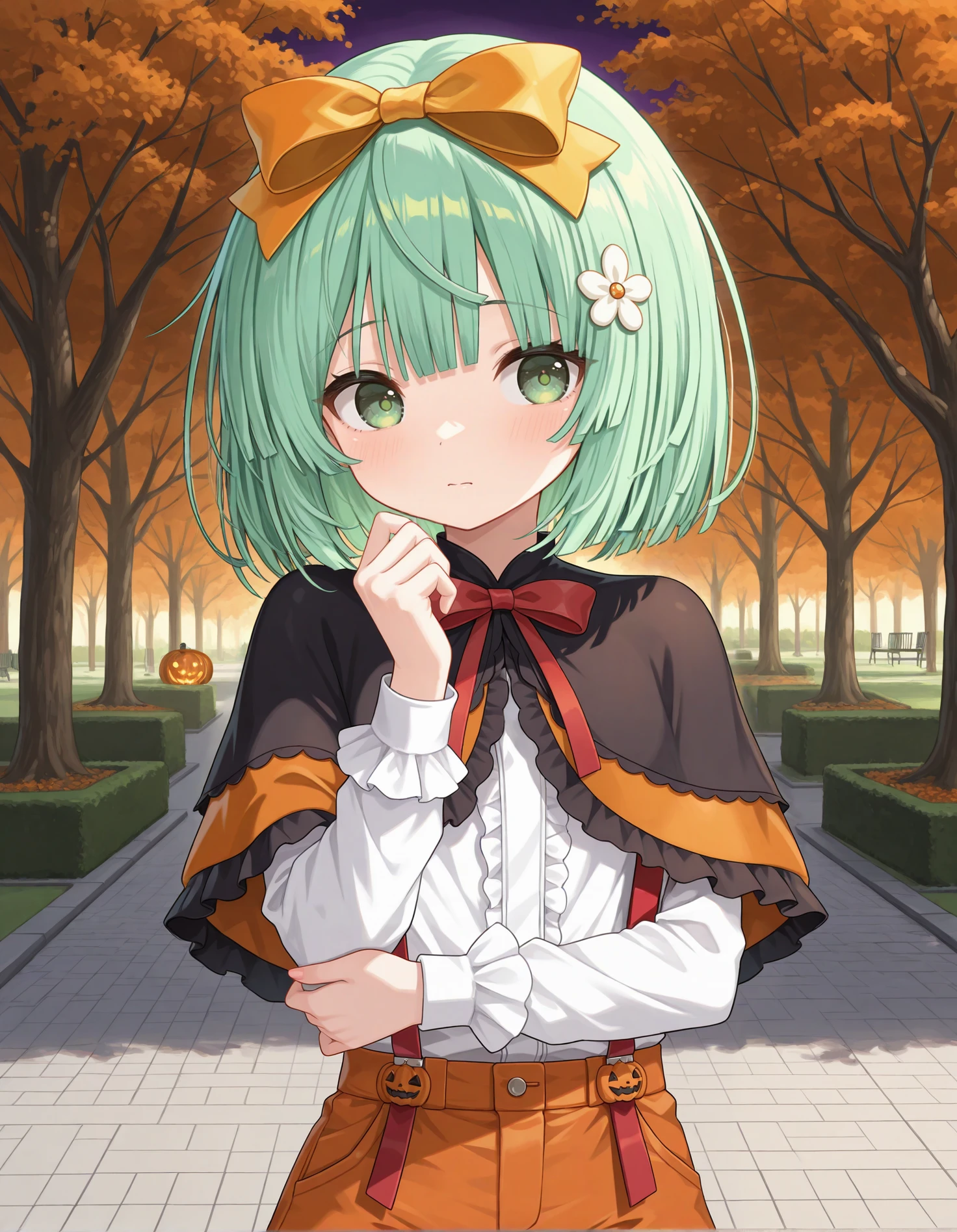 mgrckakonatsume, kakohlwn, green hair, blunt bangs, green eyes, white hairpin, yellow hair bow, red bow necktie, white frilled shirt, black with orange shawl, orange shorts, red suspenders
