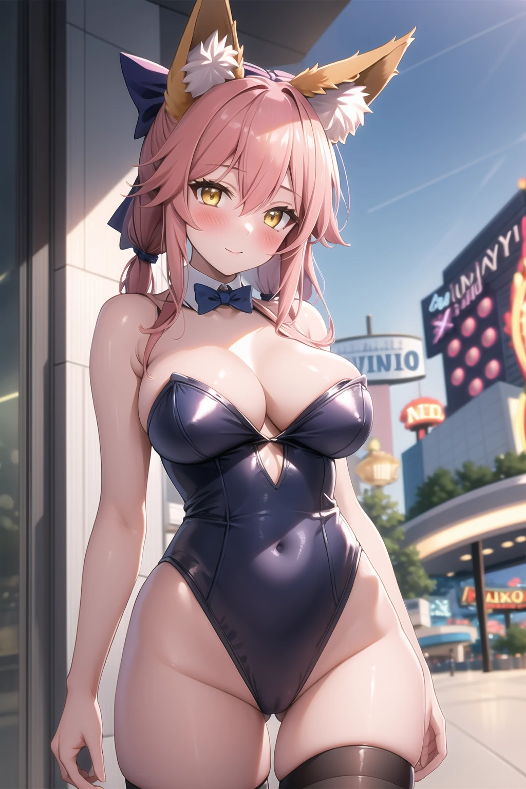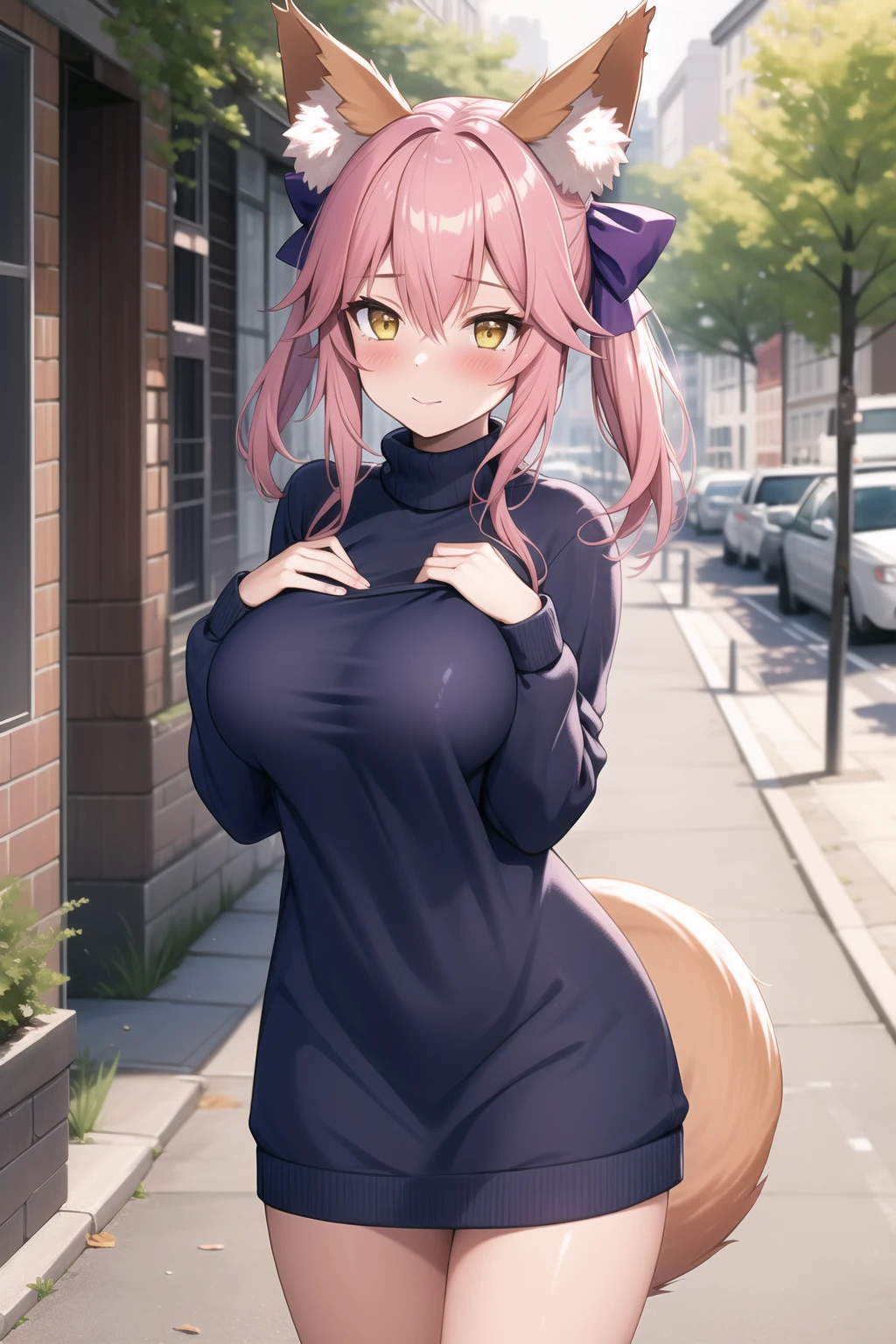appearance: tamamonm, pink hair, hair between eyes, sidelocks, short twintails, yellow eyes, animal ears, fox ears, fox tail, blue bow, large bow, hair bow, large breasts,