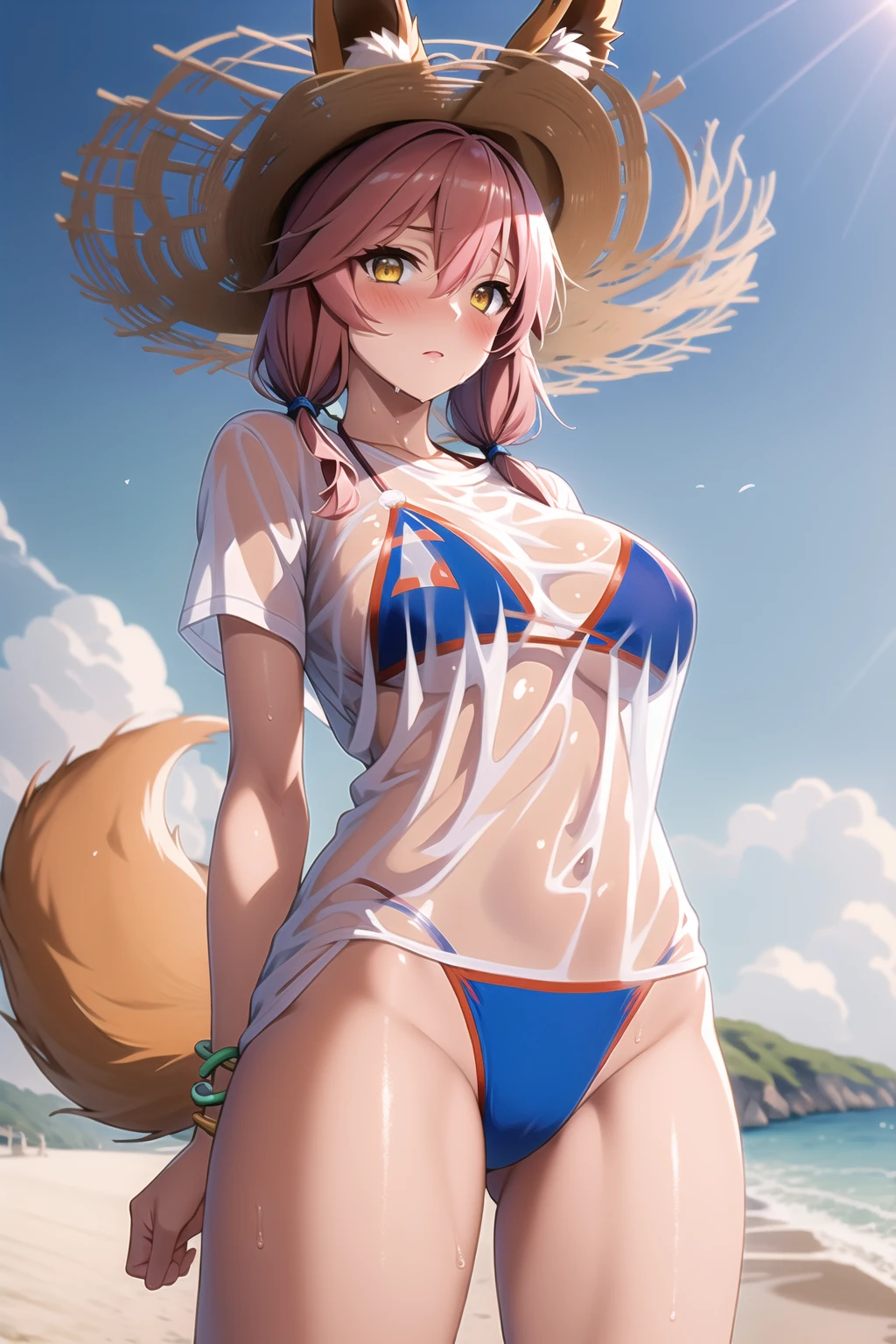 blue bikini, white shirt, wet shirt, straw hat, bracelet, bikini under clothes, t-shirt, see-through,