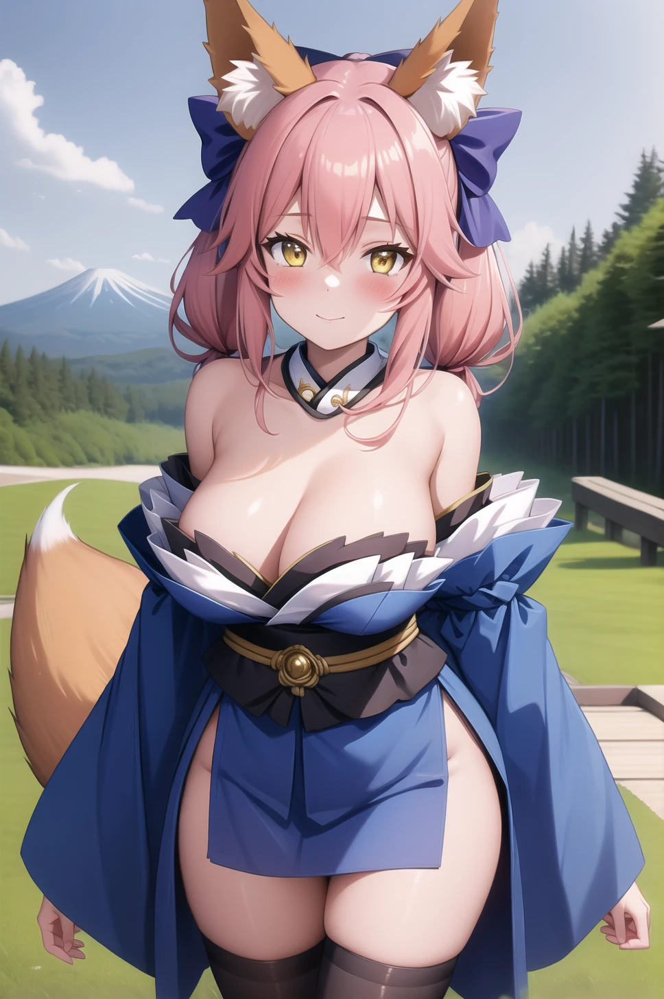 tamamonm, pink hair, hair between eyes, sidelocks, short twintails, yellow eyes, animal ears, fox ears, fox tail, blue bow, large bow, hair bow, large breasts,