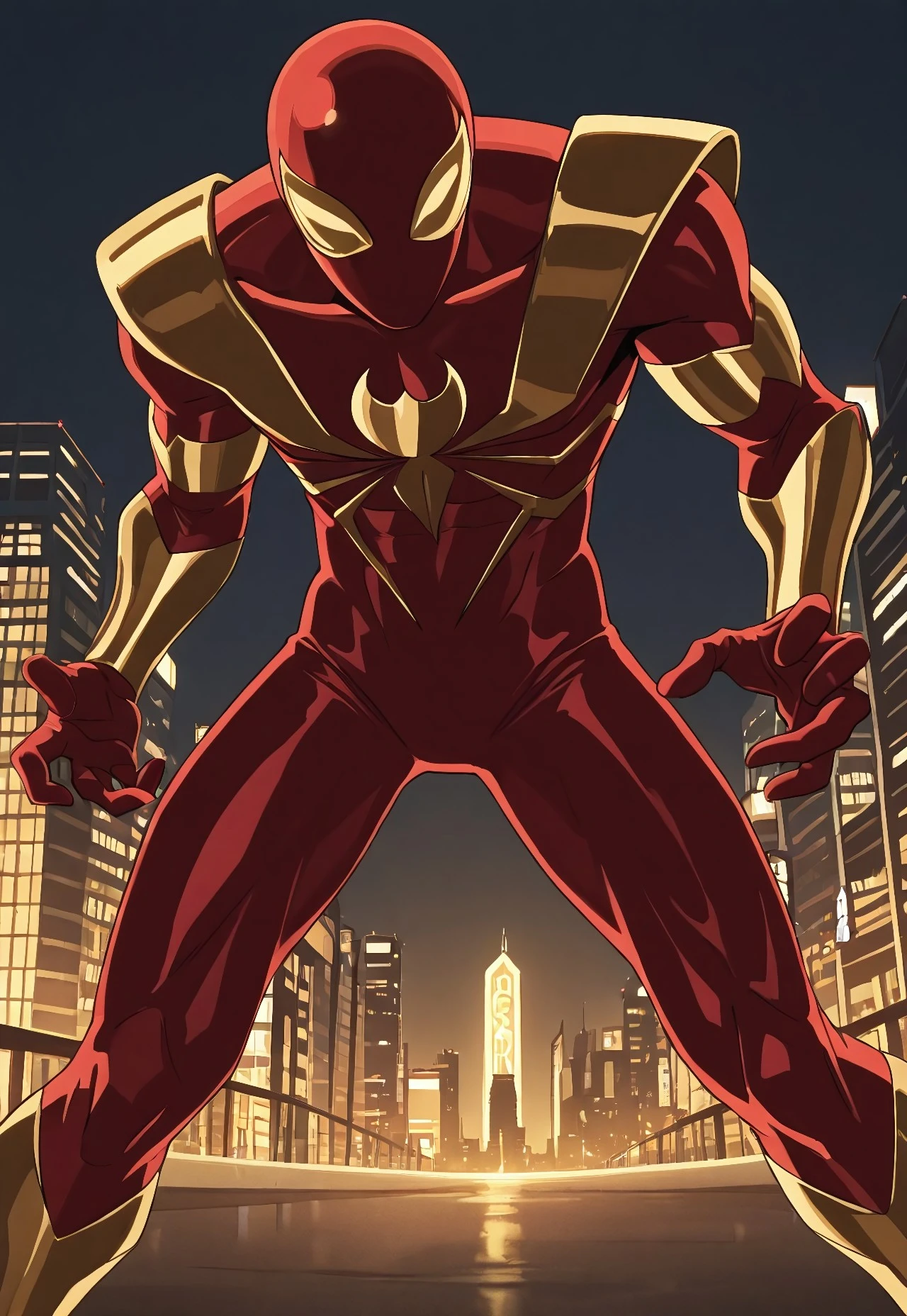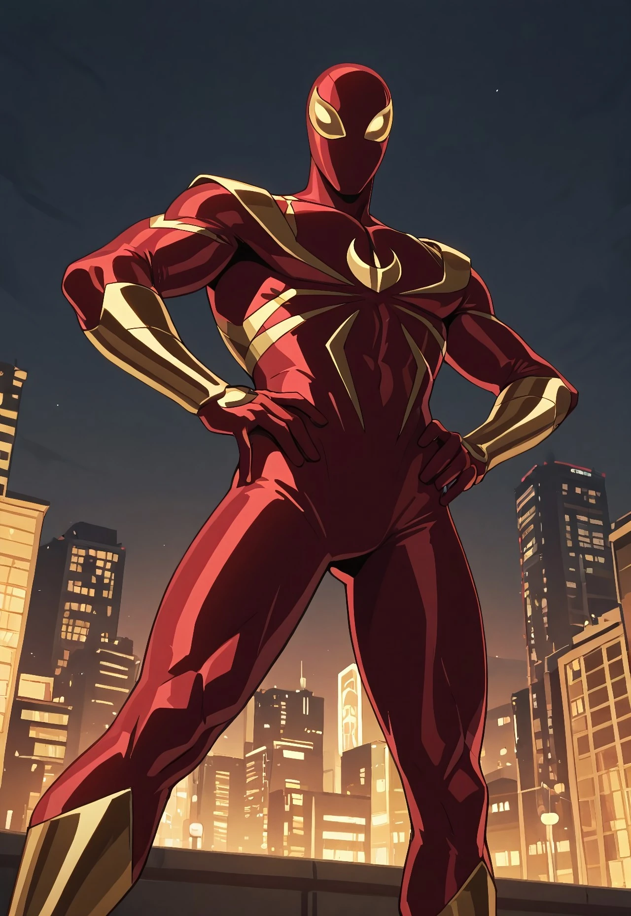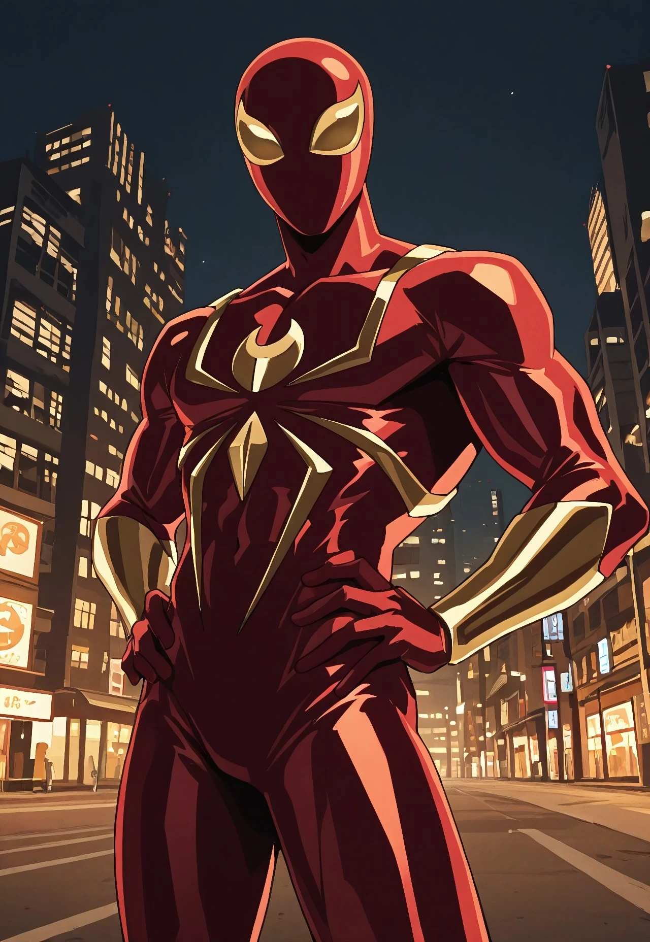 ultimate_ironspider(cartoon)IL, red_, spider print, gold print, gold_arms, gold_legs, 1boy, solo, muscular, mask, gold lenses,