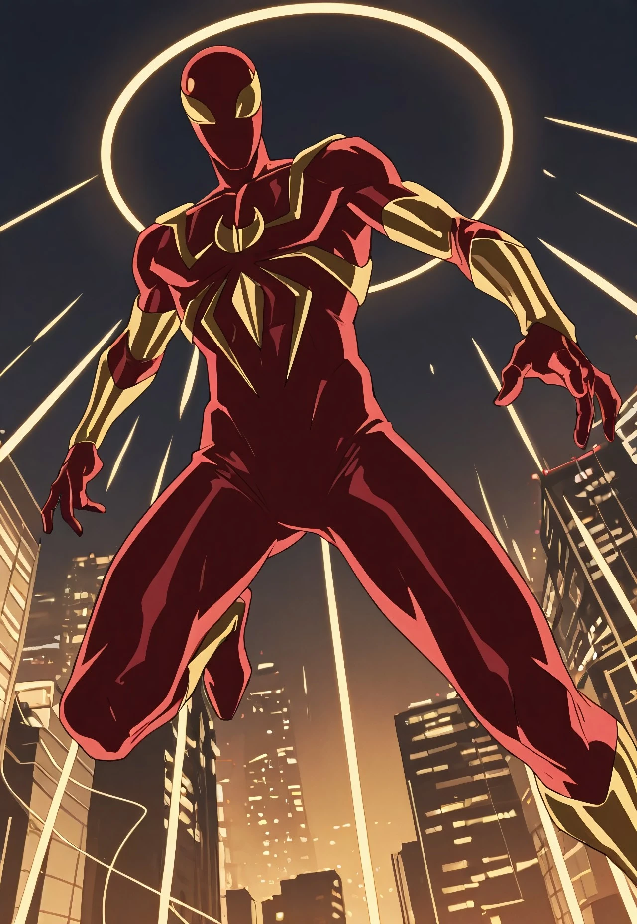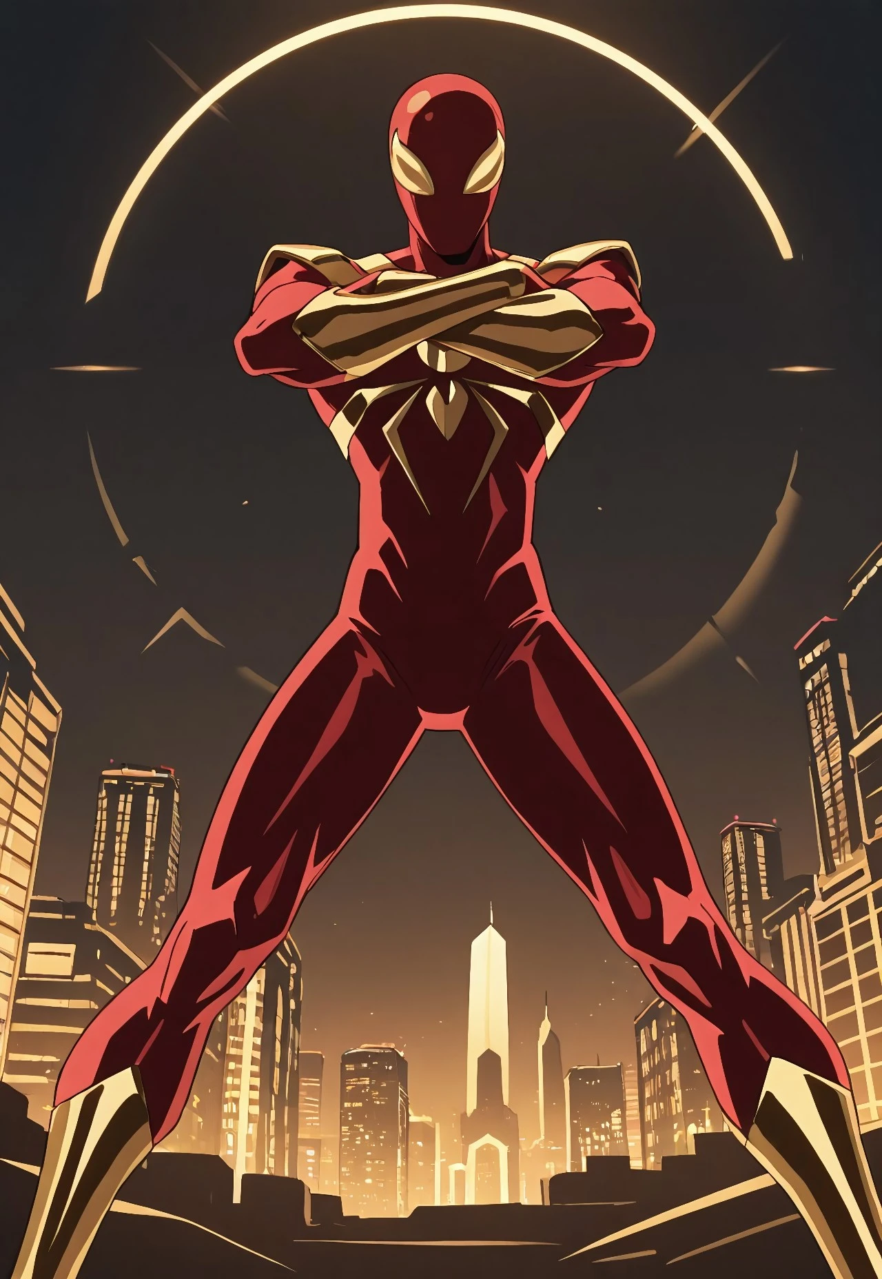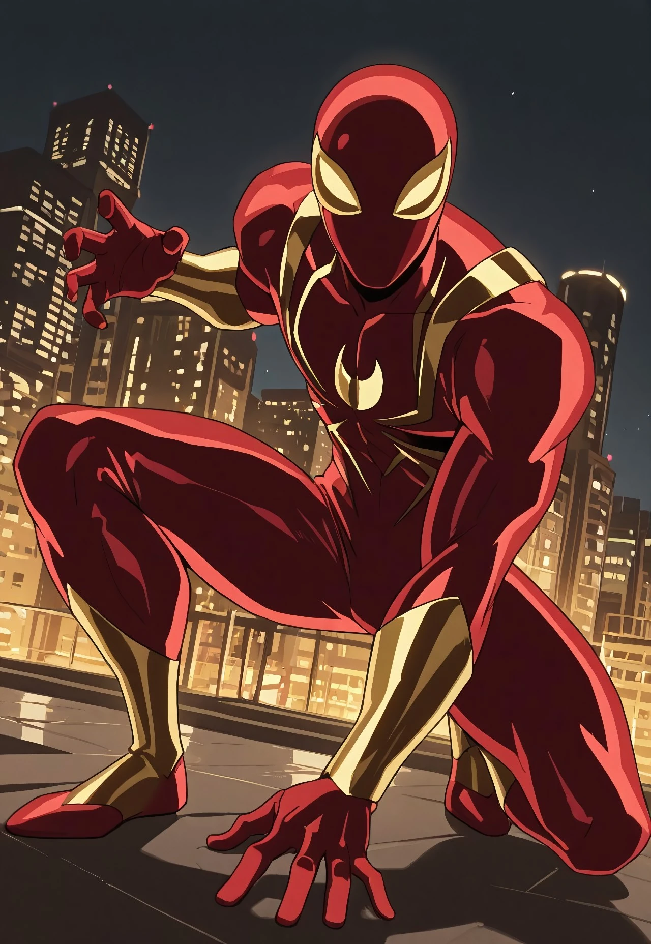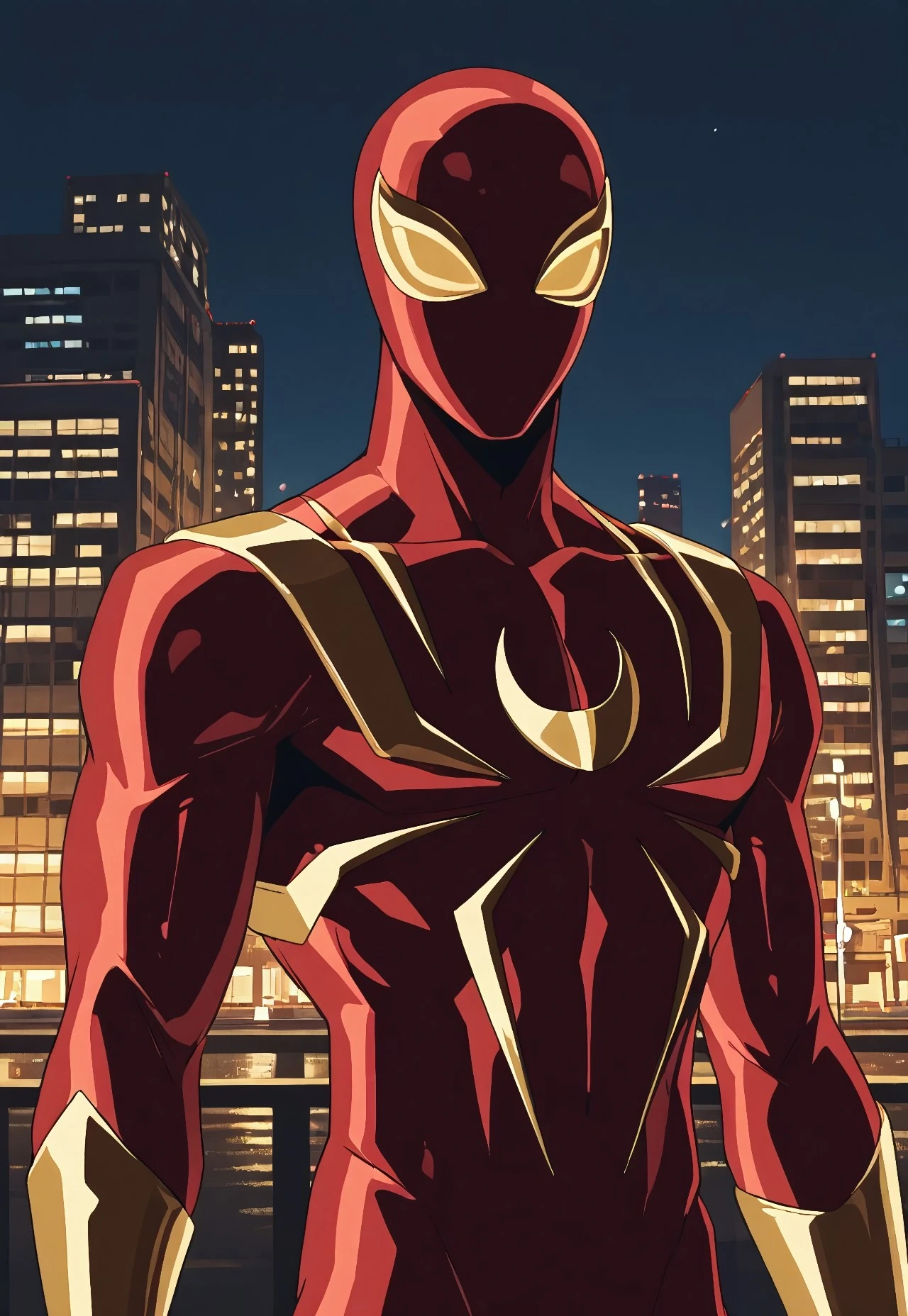 ultimate_ironspider(cartoon)IL, red_, spider print, gold print, gold_arms, gold_legs, 1boy, solo, muscular, mask, gold lenses,