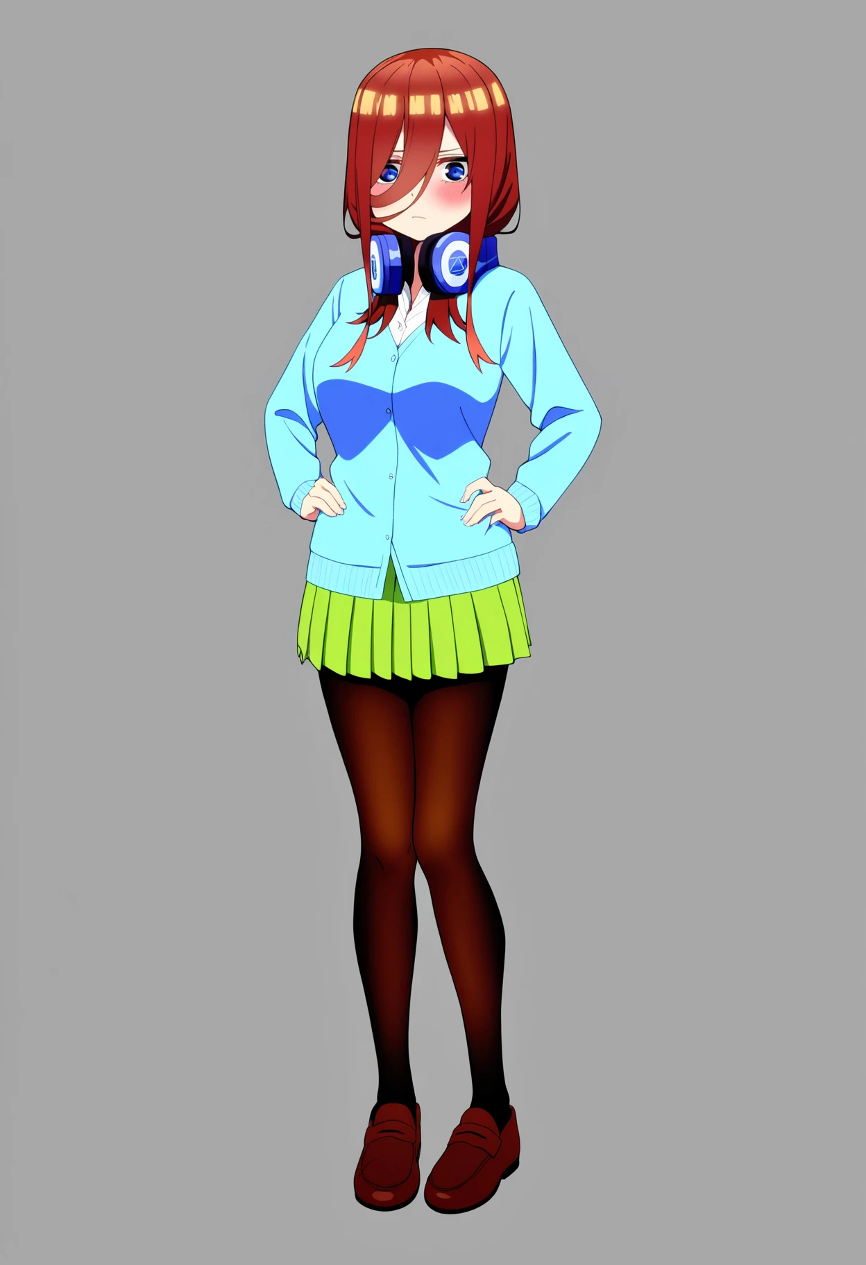 Basic outfit prompts : headphones around neck, blue cardigan, long sleeves, collared shirt, loafers