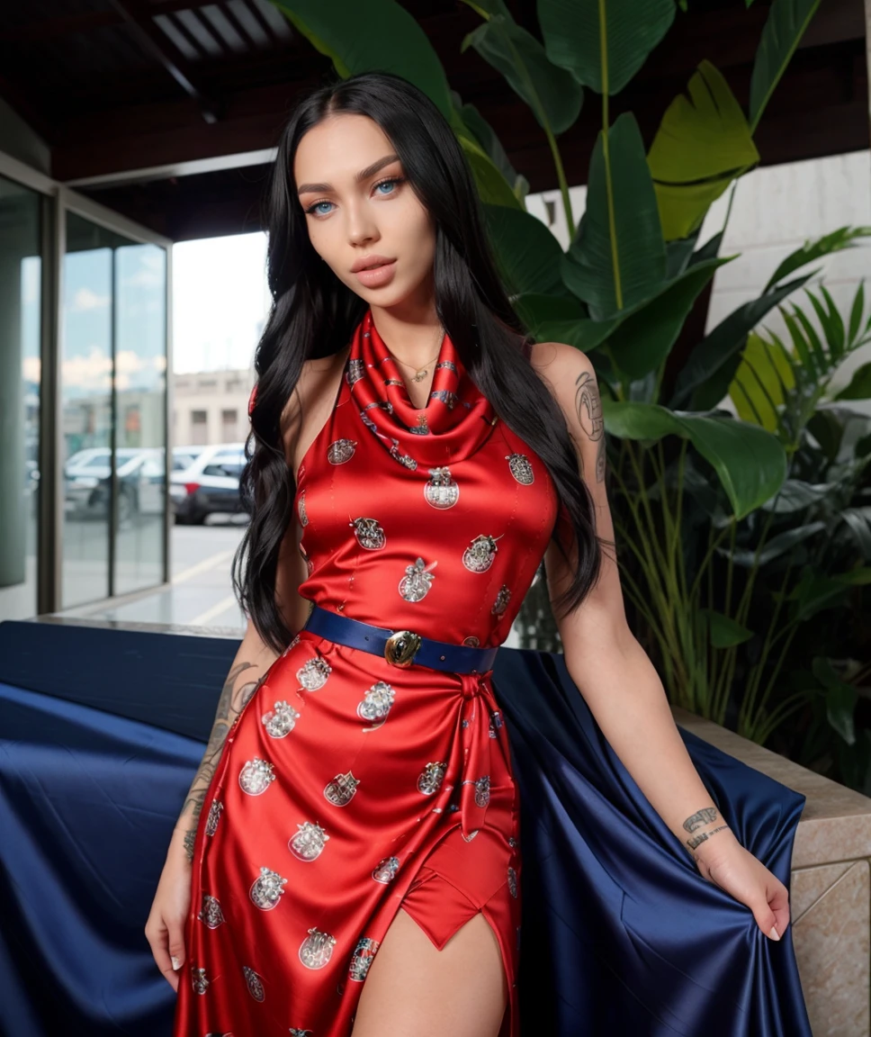 cinematic photo <lora:quiron_iammeryTS_v020330_Lora:0.77> iamMeryQuiron, 1girl, solo, looking at viewer, blue eyes, realistic, long hair, lips, tattoo, , MakeUp,, Giorgio Armani silk blouse with a draped neckline and cap sleeves, 35mm photograph, film, bokeh, professional, 4k, highly detailed