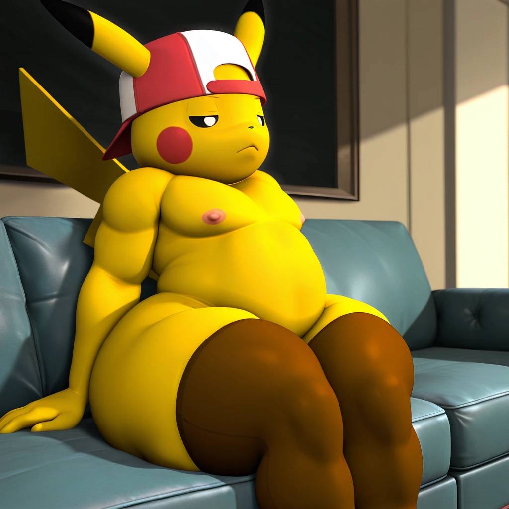 1boy, male, furry, anthro, pokemon (creature), solo, yellow body, black eyes, black nose, pointed ears, red cheeks, brown stripes on back, tail, plump, chubby, wide hips, thick thighs