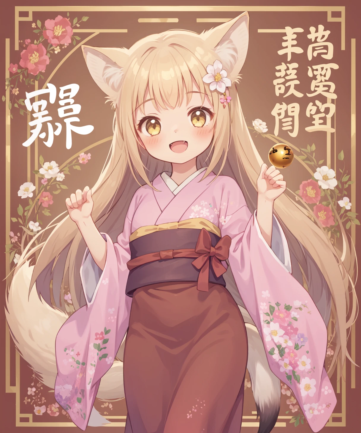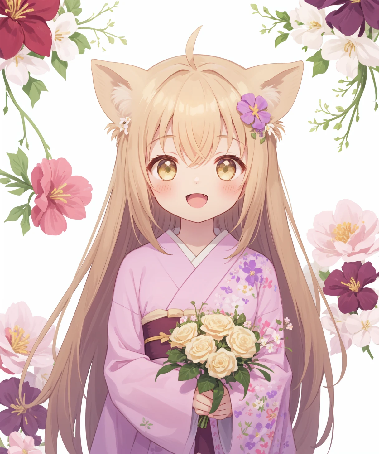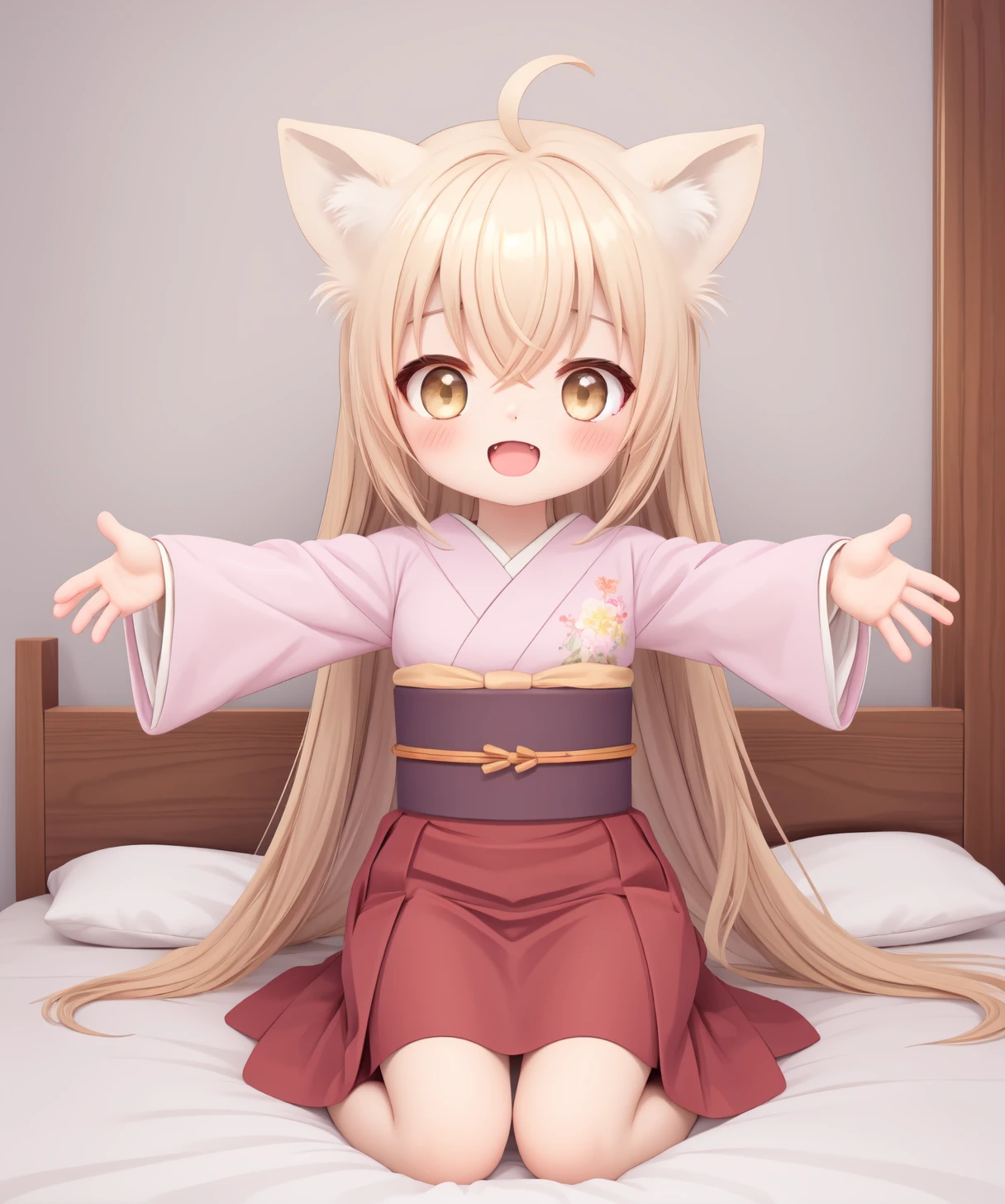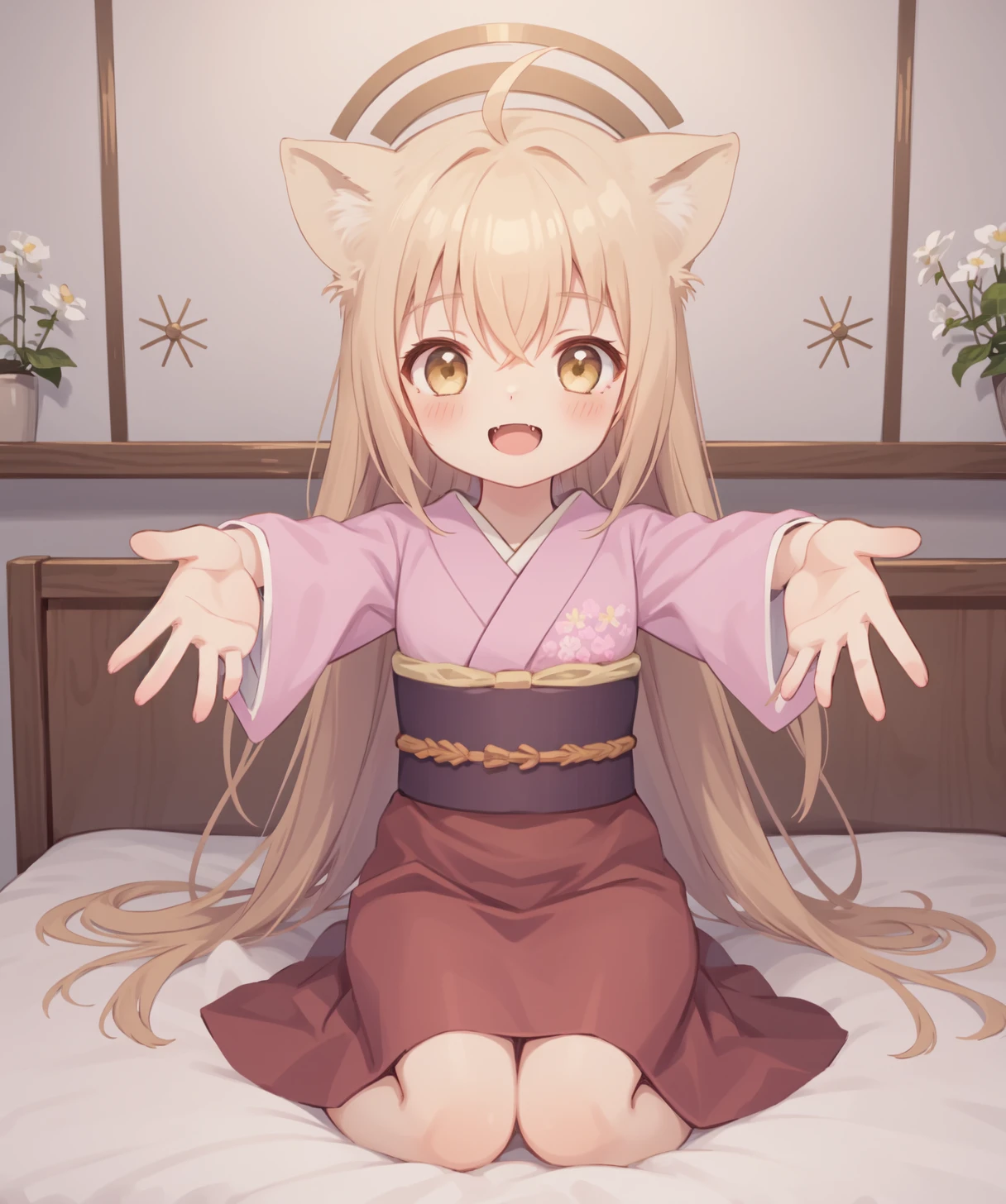 yuzu \(konohana kitan\), 1girl, long sleeves, wide sleeves, obi, pink kimono, hakama skirt, hair between eyes, ahoge