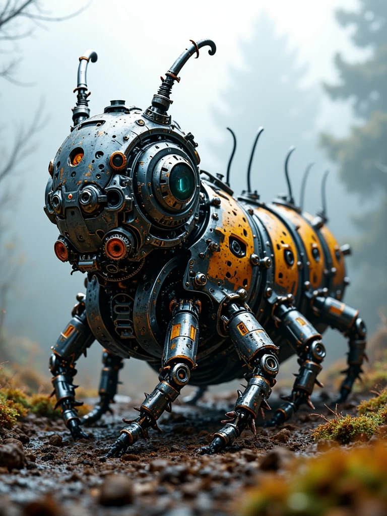 This is a highly detailed, realistic CGI image of a steampunk-style, insectoid robot set in a foggy forest. The robot has a cylindrical, orange and black spotted body with multiple mechanical legs, each adorned with gears and joints. Its head features a large, green, circular eye with a central number 1, and various antennae and tubes protruding from it. The background shows blurred, misty trees and moss-covered ground, enhancing the eerie, mystical atmosphere. The robots textures are metallic with a mix of rust and paint, giving it an aged, industrial look. The image combines elements of sci-fi and fantasy, creating a unique, otherworldly creature.