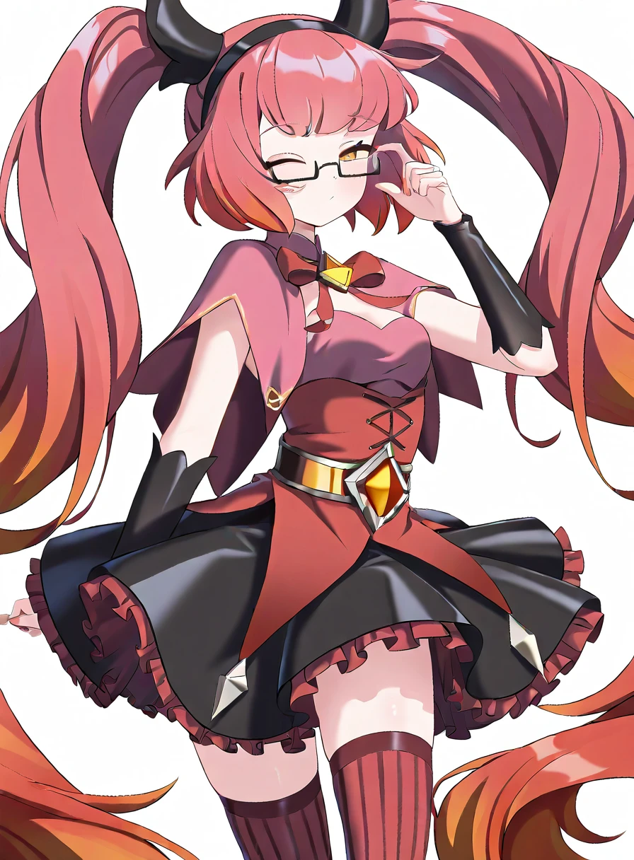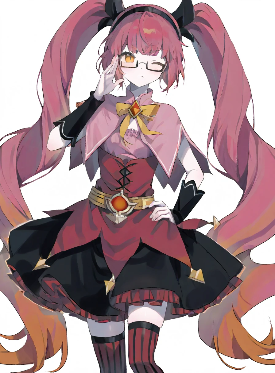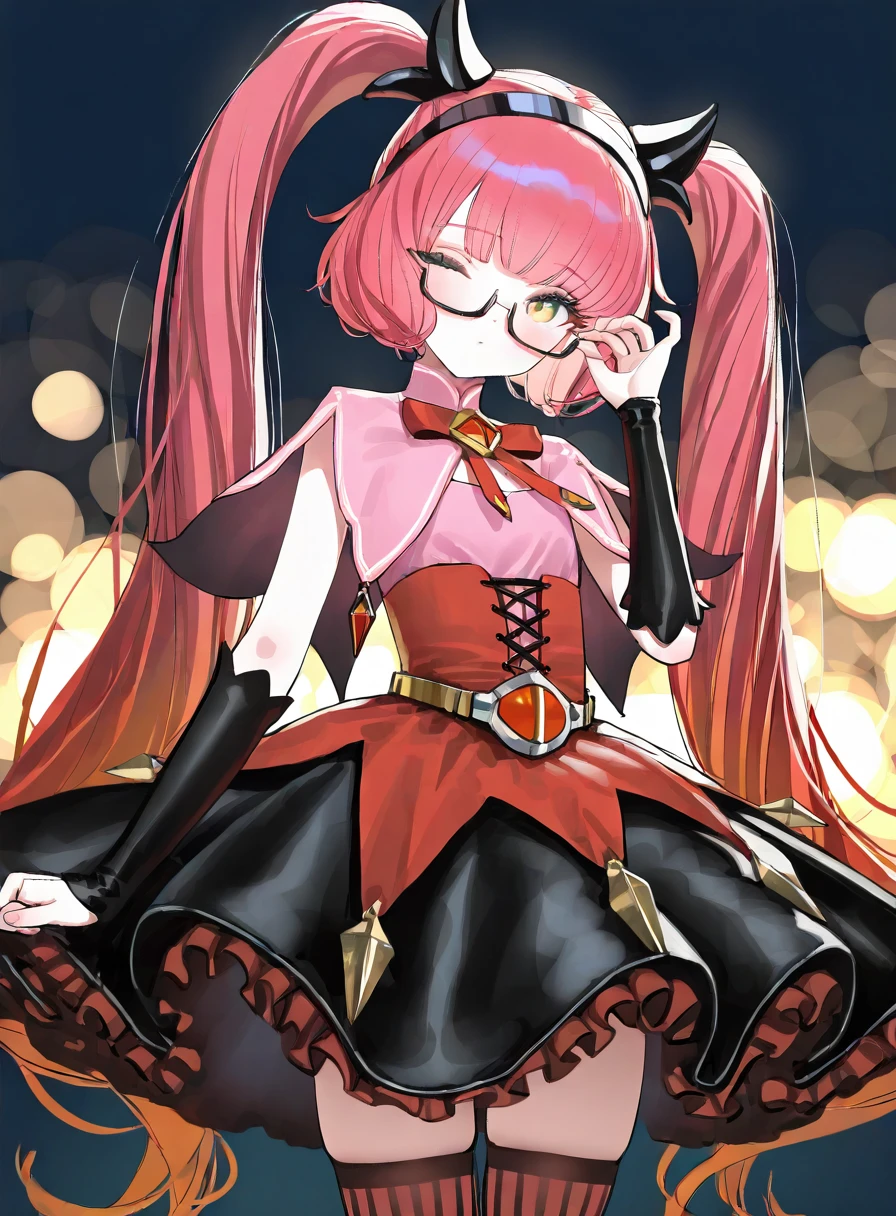 twintails,glasses,hairband,bow,dress,striped clothes,thighhighs,skirt,semi-rimless eyewear,