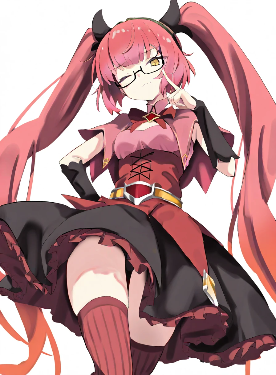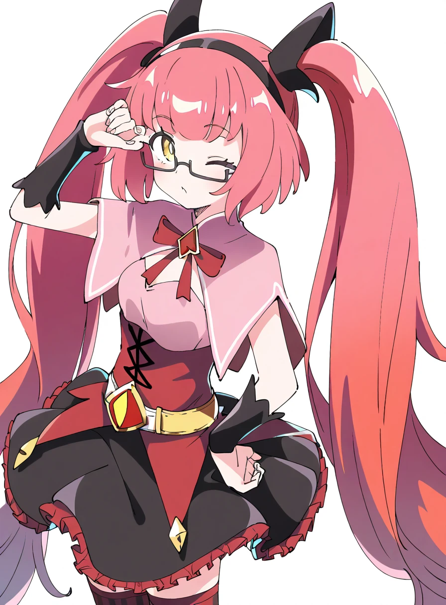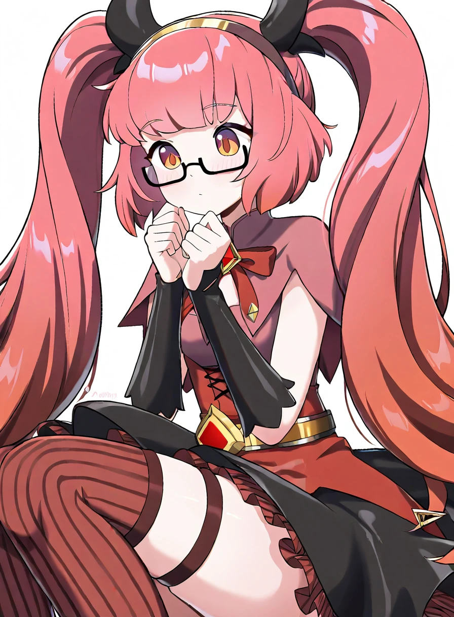 twintails,glasses,hairband,bow,dress,striped clothes,thighhighs,skirt,semi-rimless eyewear,