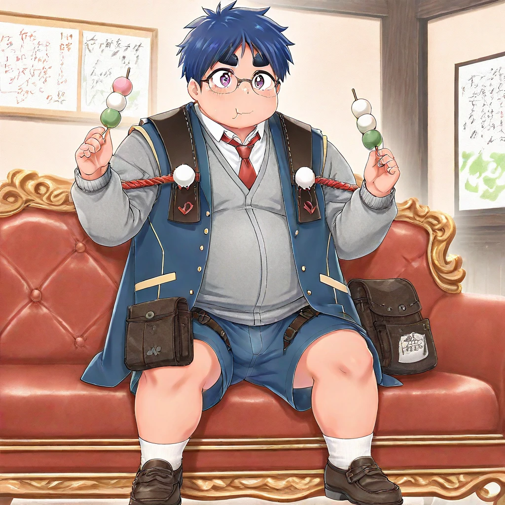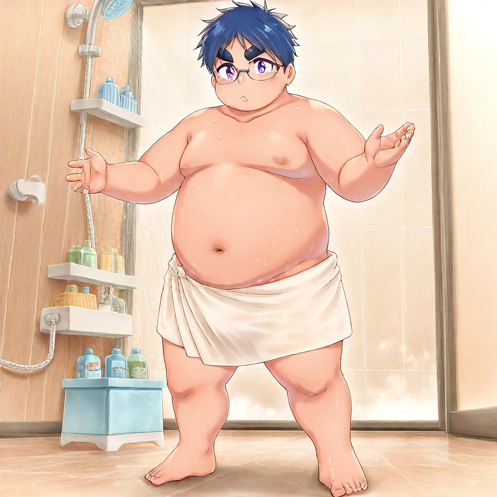 t-natsuto, 1boy, male focus, solo, male, young adult, chubby, round face, purple eyes, blue hair, short messy hair, glasses, smart look, thick eyebrows