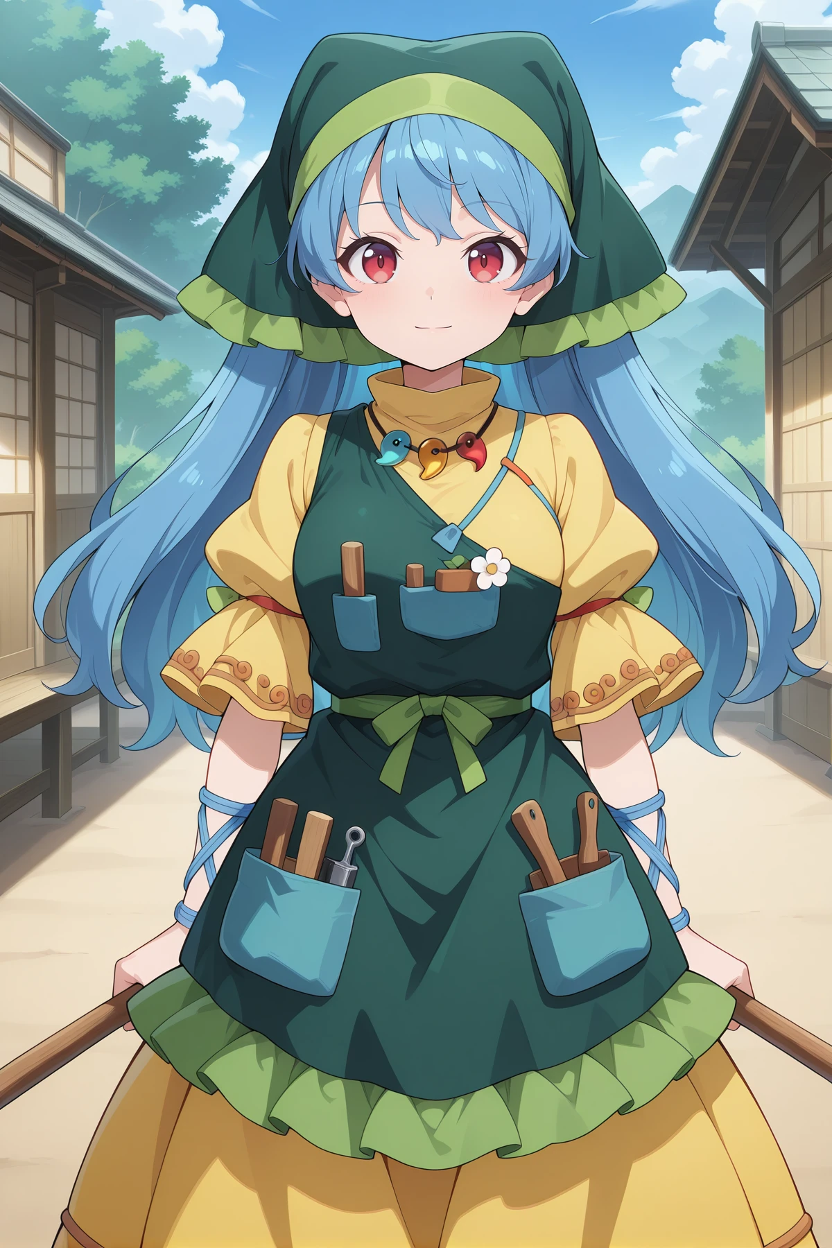 haniyasushin keiki, 1girl, solo, red eyes, blue hair, long hair,