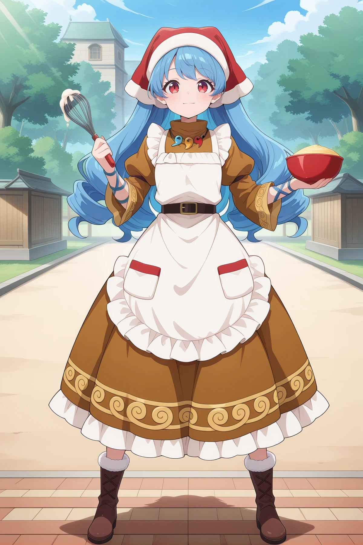 haniyasushin keiki, 1girl, solo, red eyes, blue hair, long hair, haniyasushin keiki \(flour egg & milk are all i need!\), alternate costume, alternate hairstyle, drill hair, brown headscarf, fur-trimmed headscarf, santa hat, brown dress, fur-trimmed apron, white apron, long sleeves, white sleeves, magatama necklace, white frills, fur-trimmed shoes, brown boots, holding bowl, holding whisk,