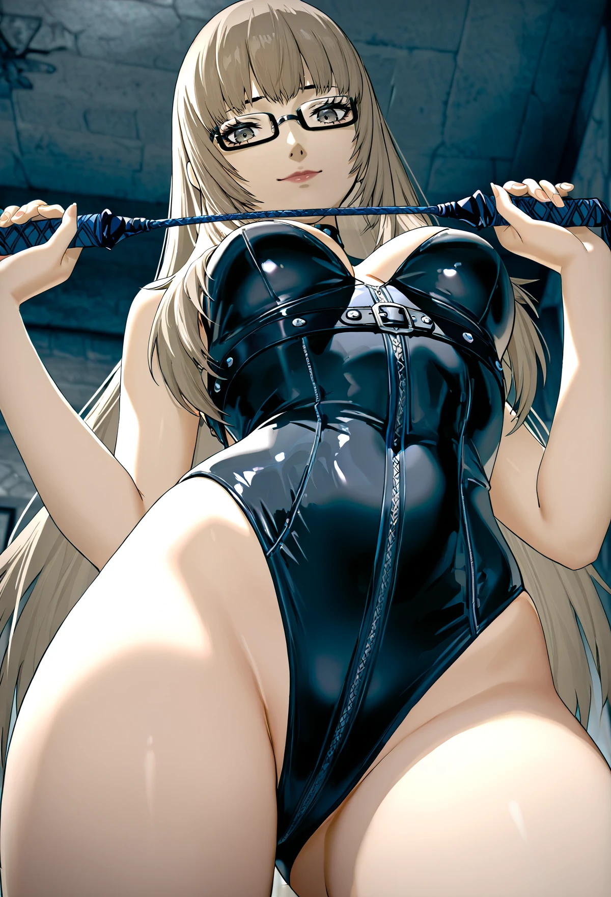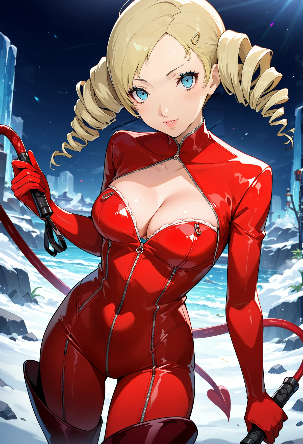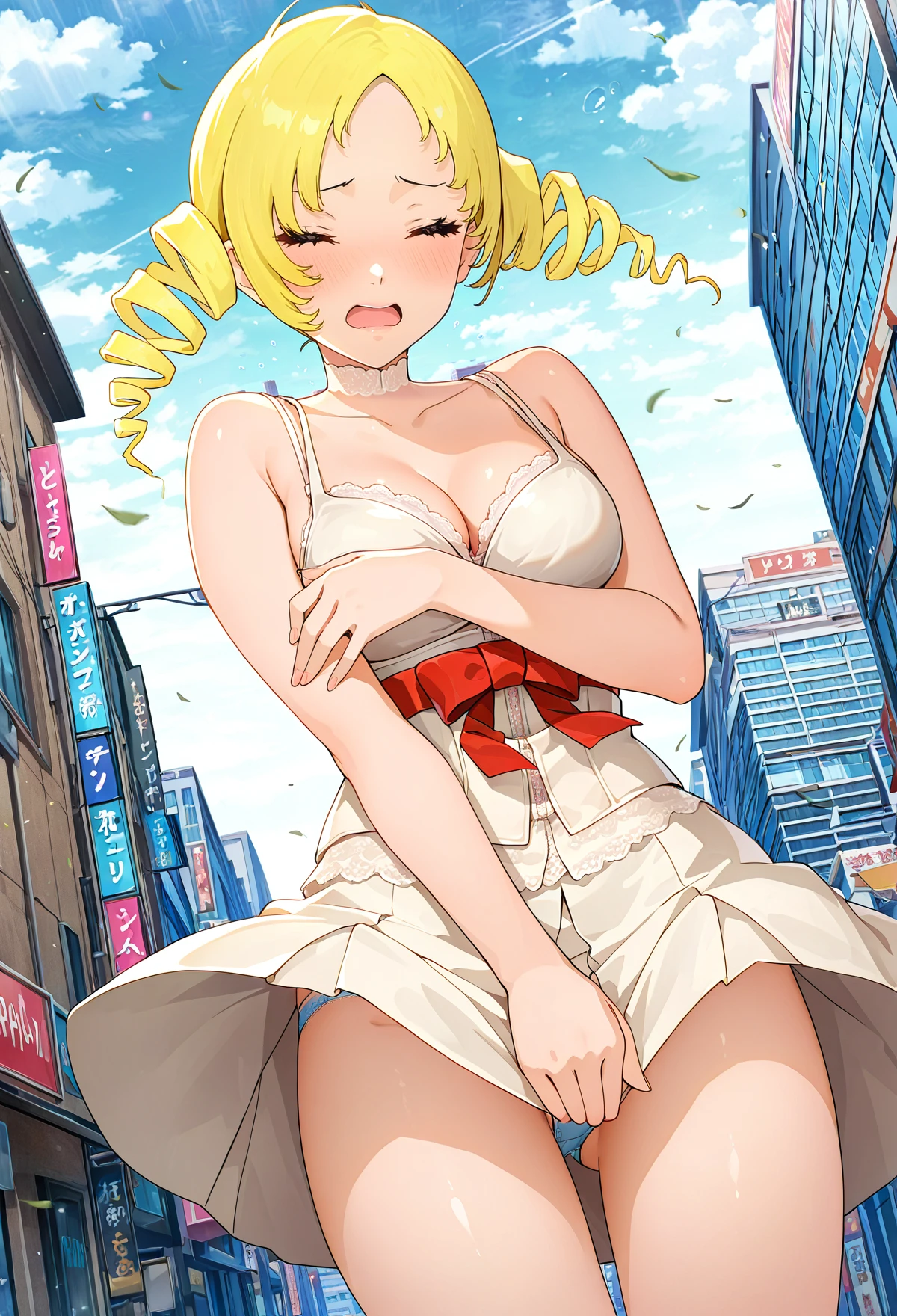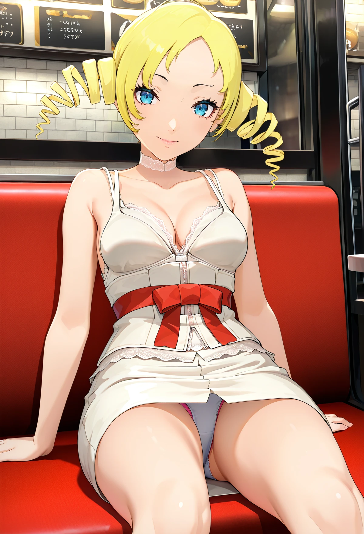 Catherine's main outfit: catherine, blonde hair, twin drills, makeup, blue eyes, white choker, white dress, red waist bow, white thighhighs