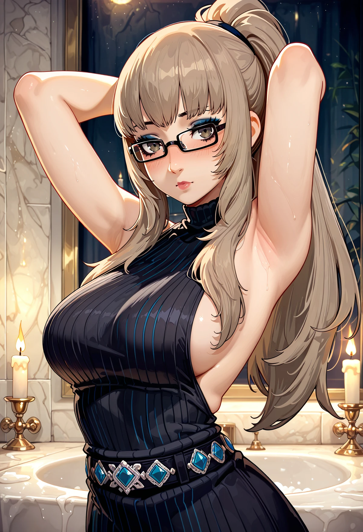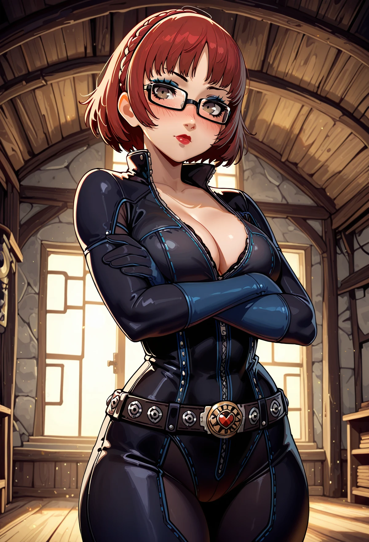 Katherine's main outfit: katherine mcbride, glasses, brown hair, long hair, black turtleneck sweater, belt, black pants