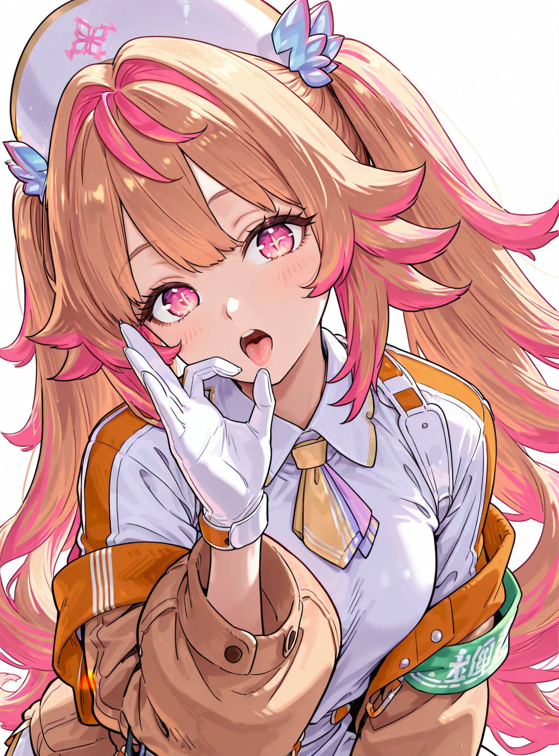 luminous_ms, 1girl, solo, long hair, open mouth, blonde hair, hat, 4 button gloves, dress, pink hair, multicolored hair, pink eyes, armband, orange jacket, necktie, nurse cap