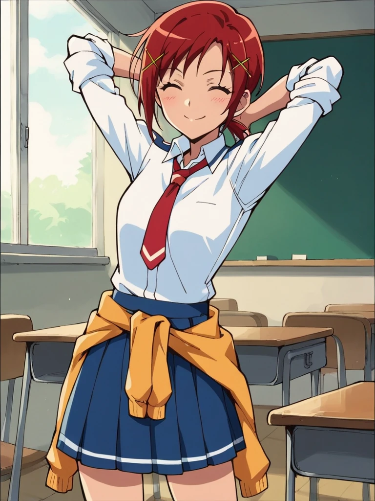 School: school uniform, white shirt, long sleeves, red necktie, blue skirt, sleeves rolled up, sweater around waist,