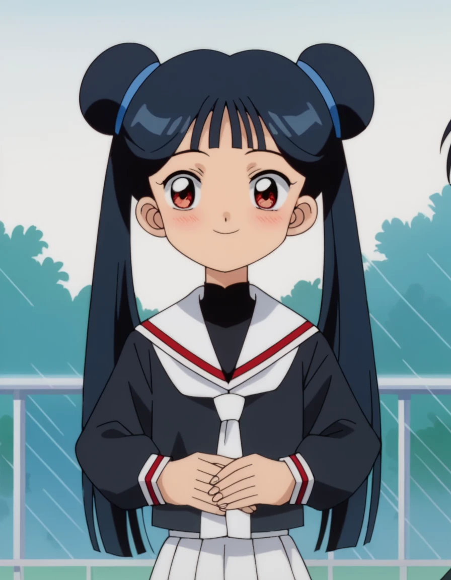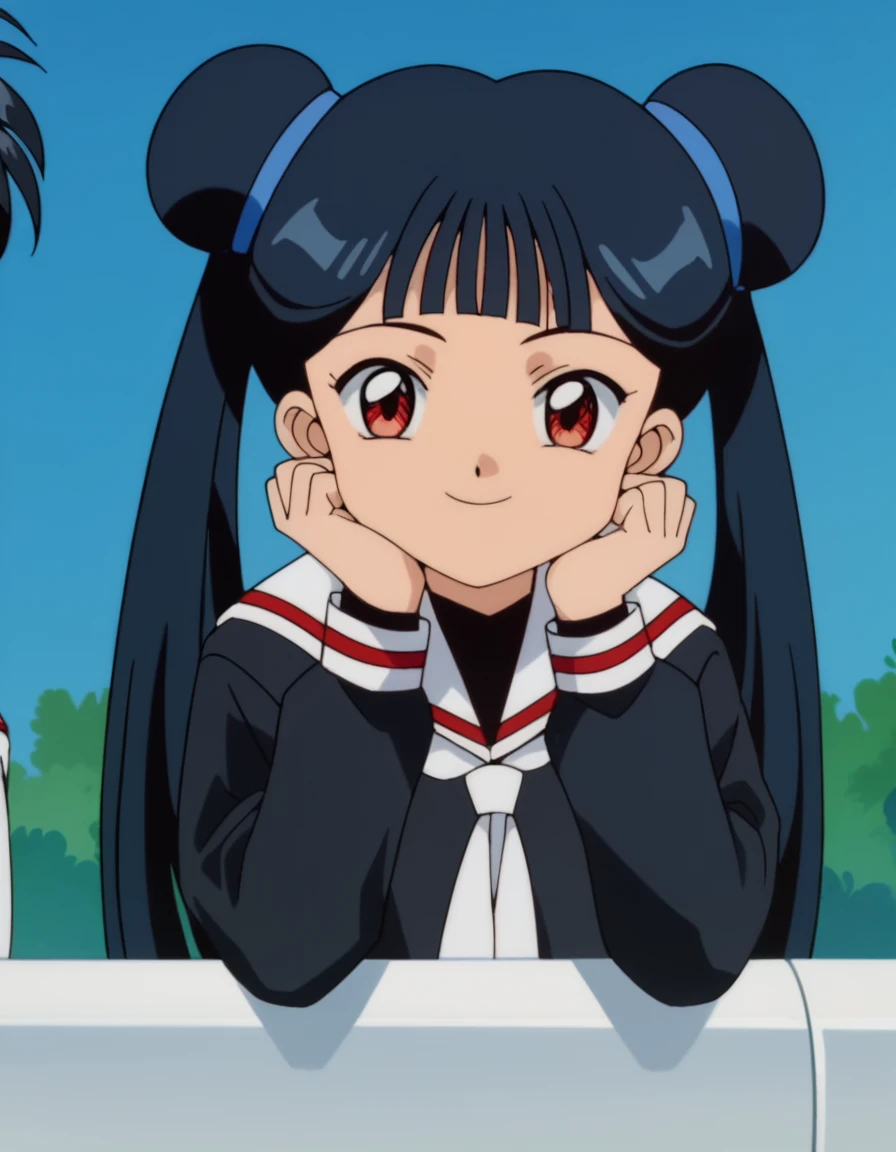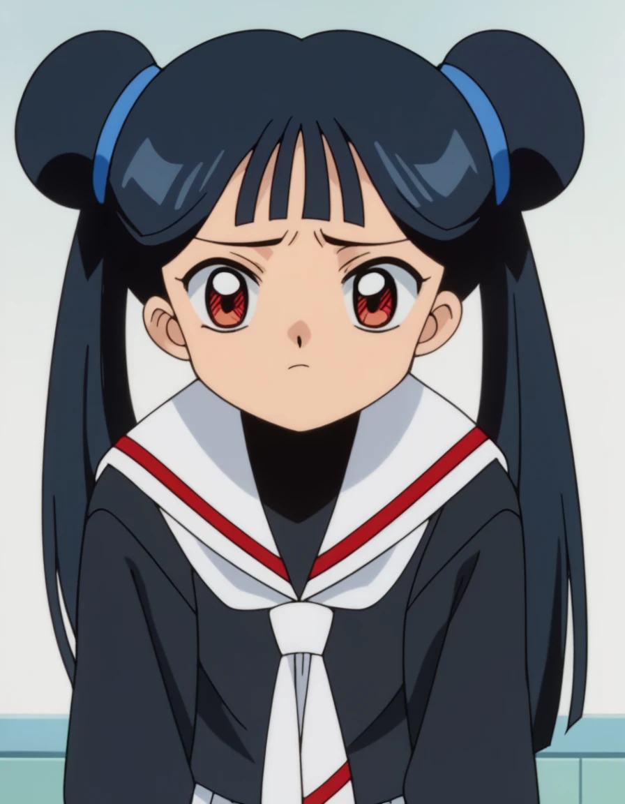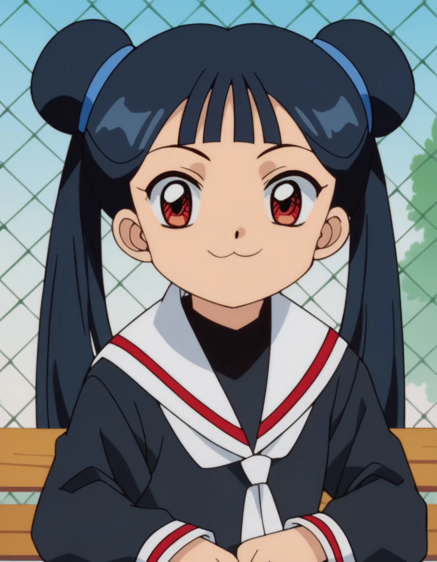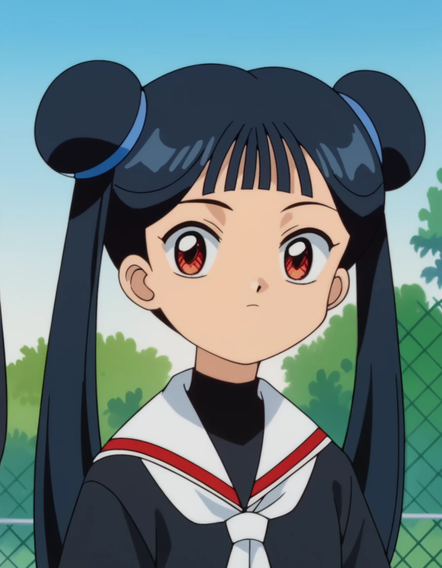 meiling li, long hair, bangs, black hair, red eyes, twintails, blunt bangs, hair bun, double bun, anime screencap
