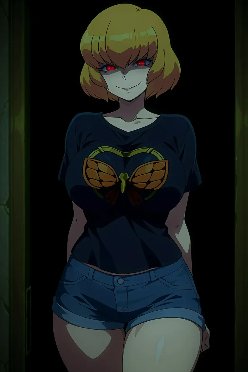 1girl, Clementine (Overlord), red eyes, blonde hair, short hair, huge breasts, curvy, extremely sexy, wide hips, thick thighs,