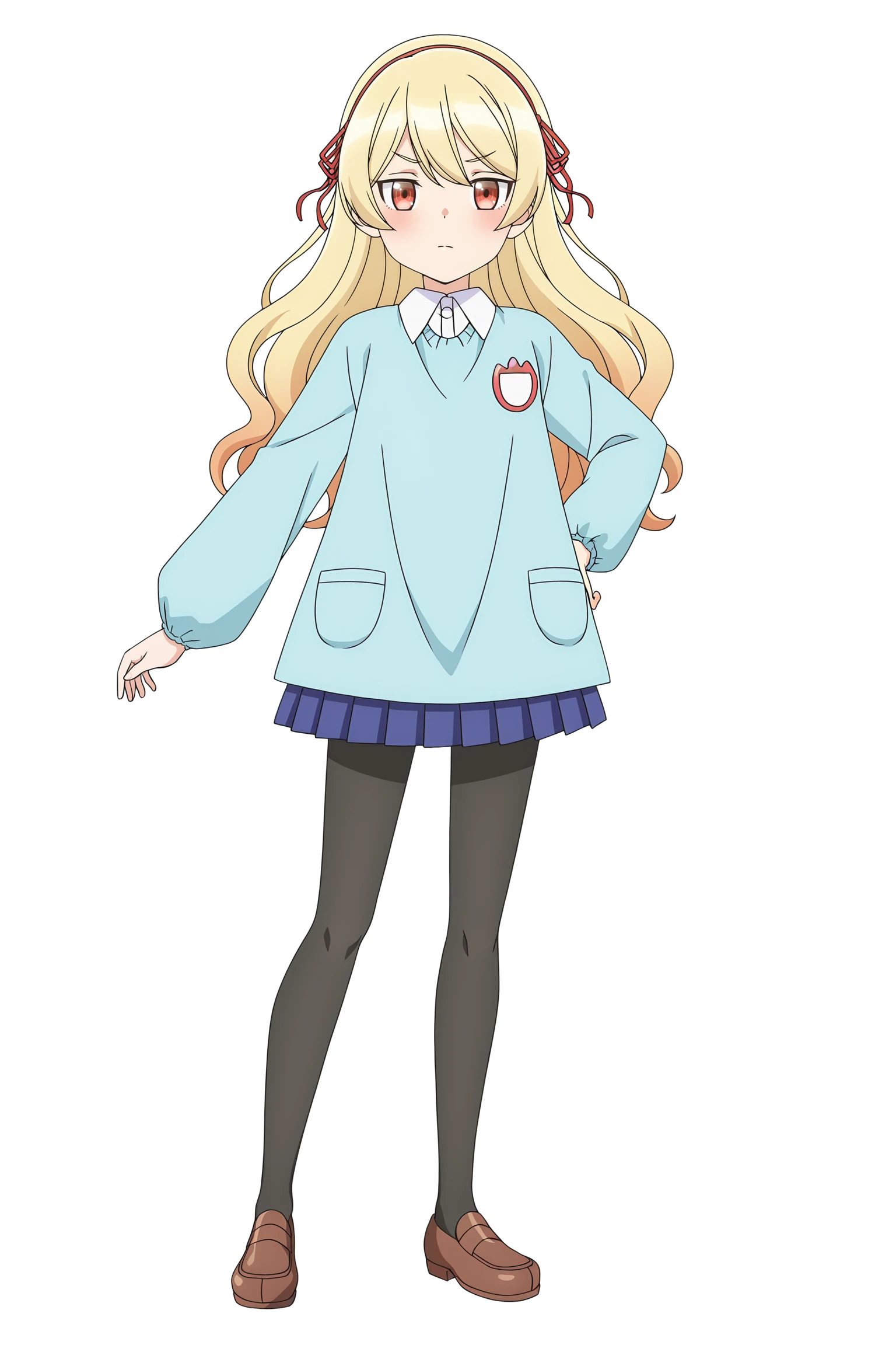 blue skirt,light blue sweater,hair ribbon,red ribbon,white shirt,loafers,oversized clothes,collared shirt,black pantyhose,