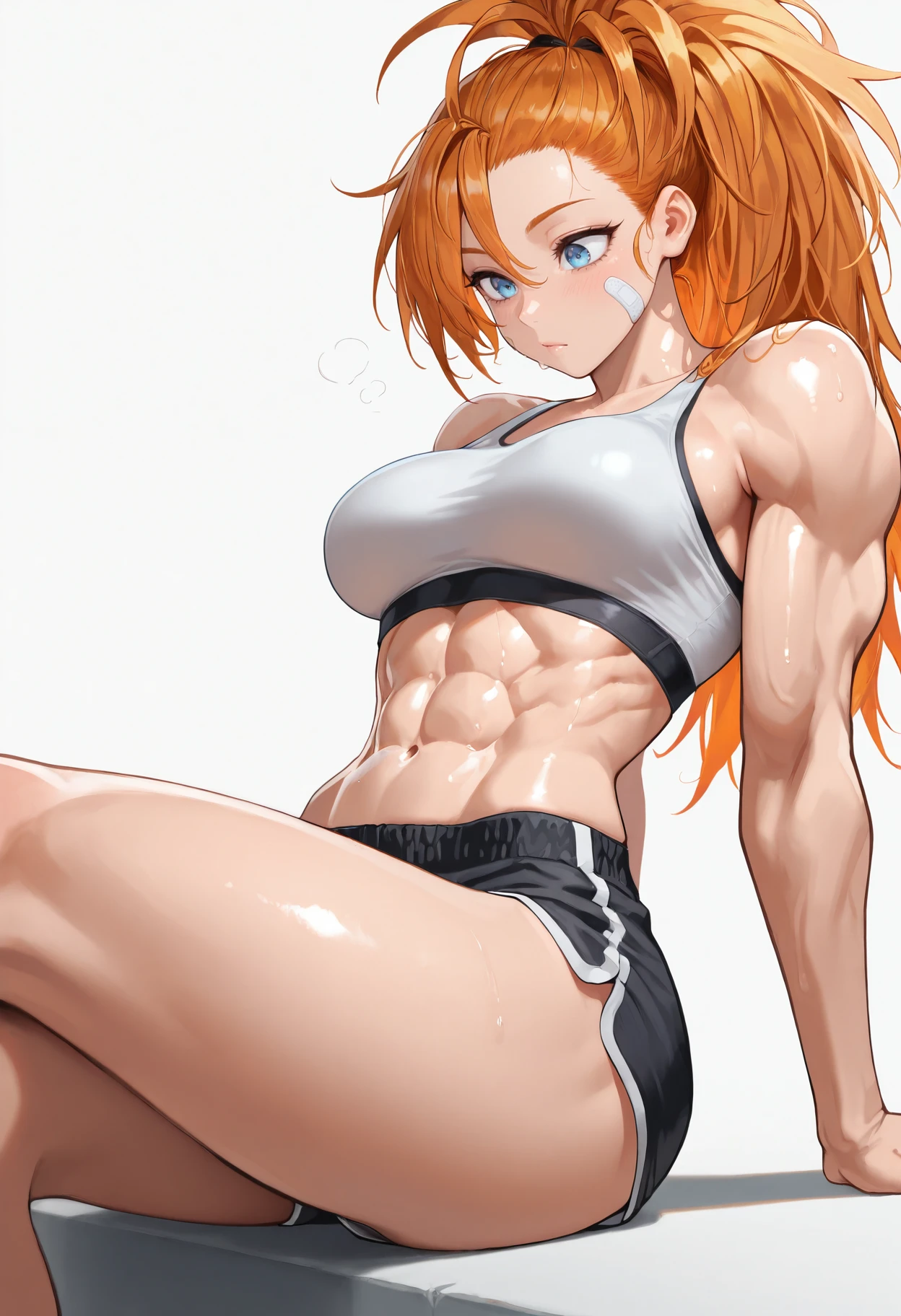 captain mizuki, abs, bandaid on cheek, blue eyes, blue scrunchie,orange hair, hair pulled back, high ponytail, muscular female