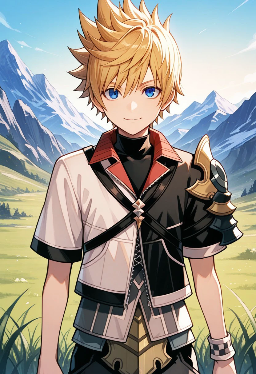 ventus, 1boy, male focus, solo, blue eyes, blonde hair, spiked hair, shirt, black shirt, turtleneck, jacket, multicolored jacket, multicolored clothes, black jacket, white jacket, lapels, red lapels, zipper, zipper pull tab, short sleeves, shoulder armor, wristband, multicolored pants, black pants, brown pants, capri pants, shoes,