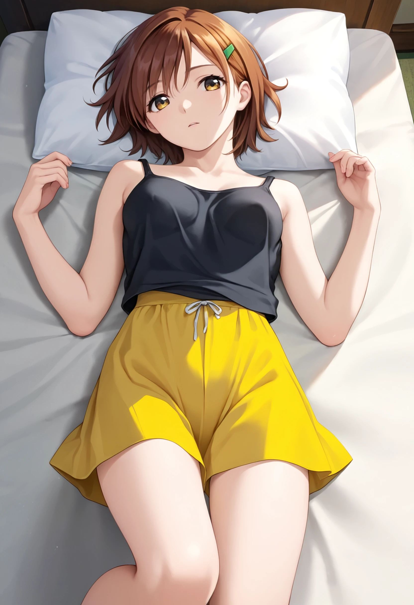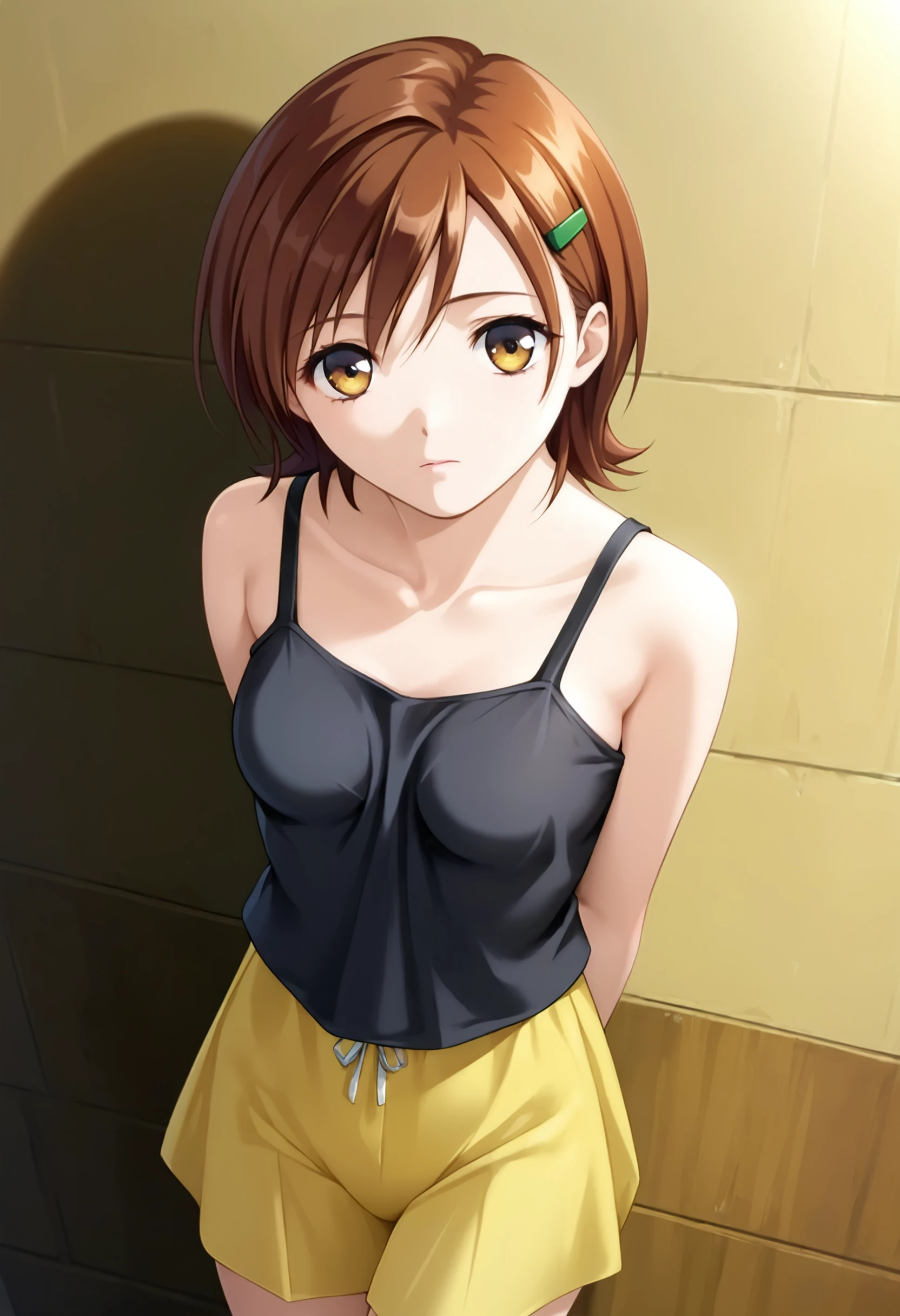 AnnaSanjou, brown hair, short hair, green hairclip, brown eyes