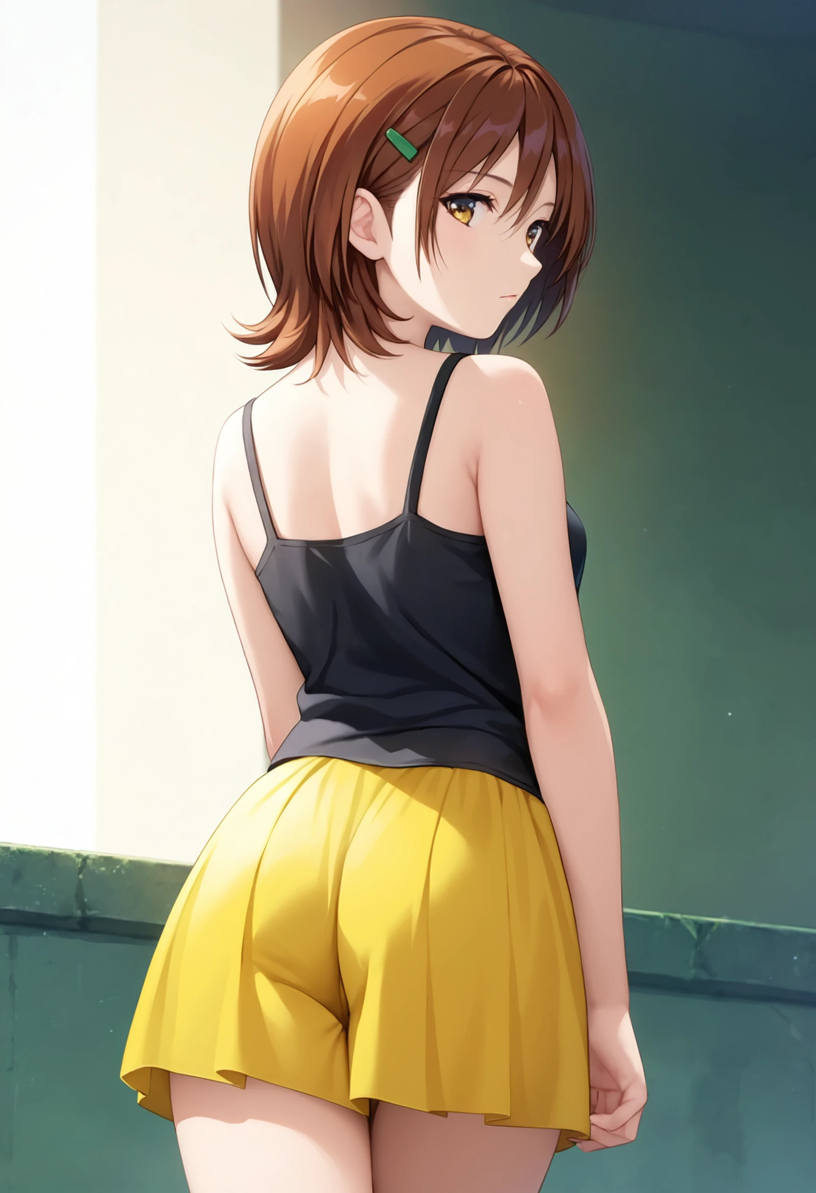 yellow skirt, black tank top