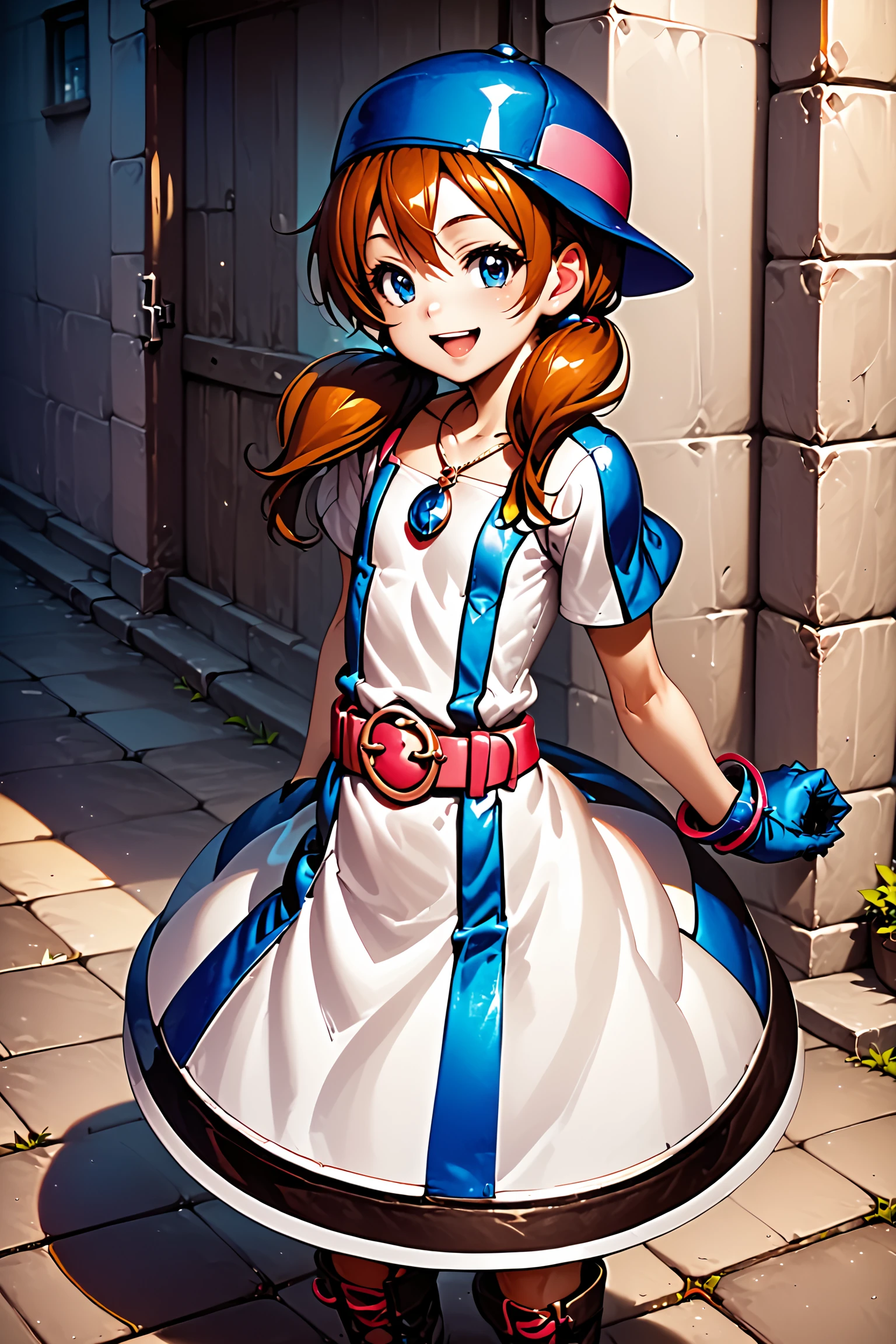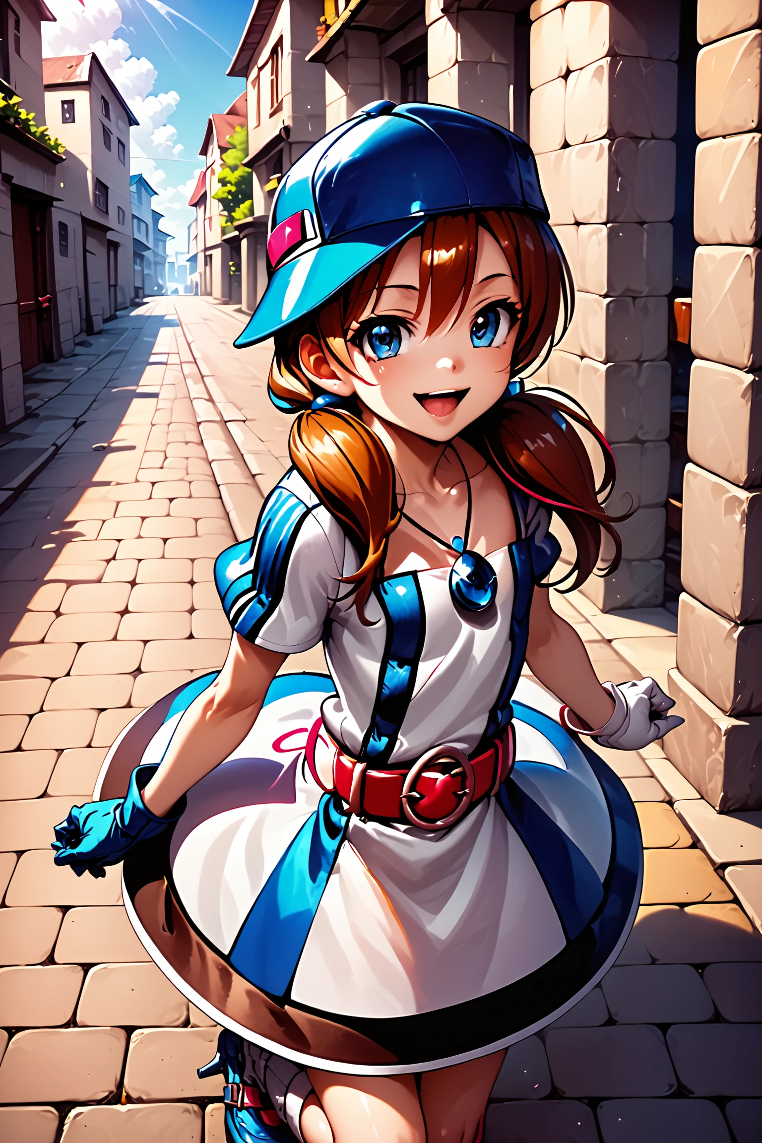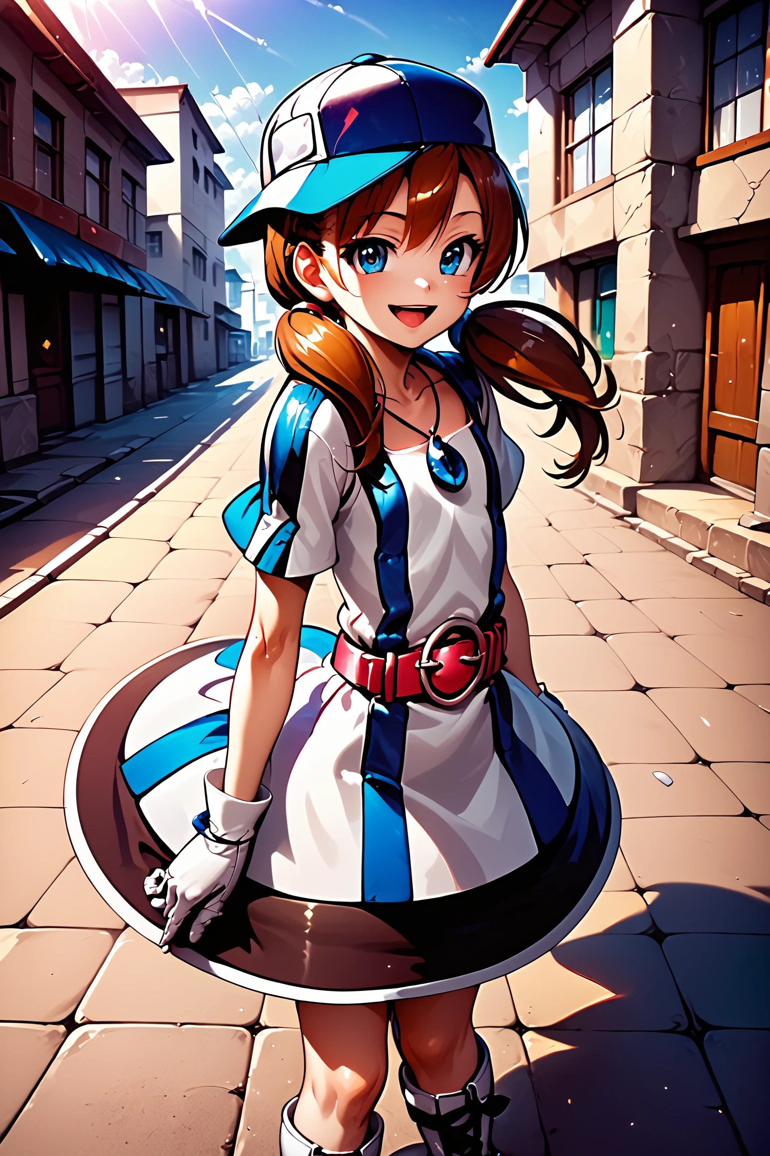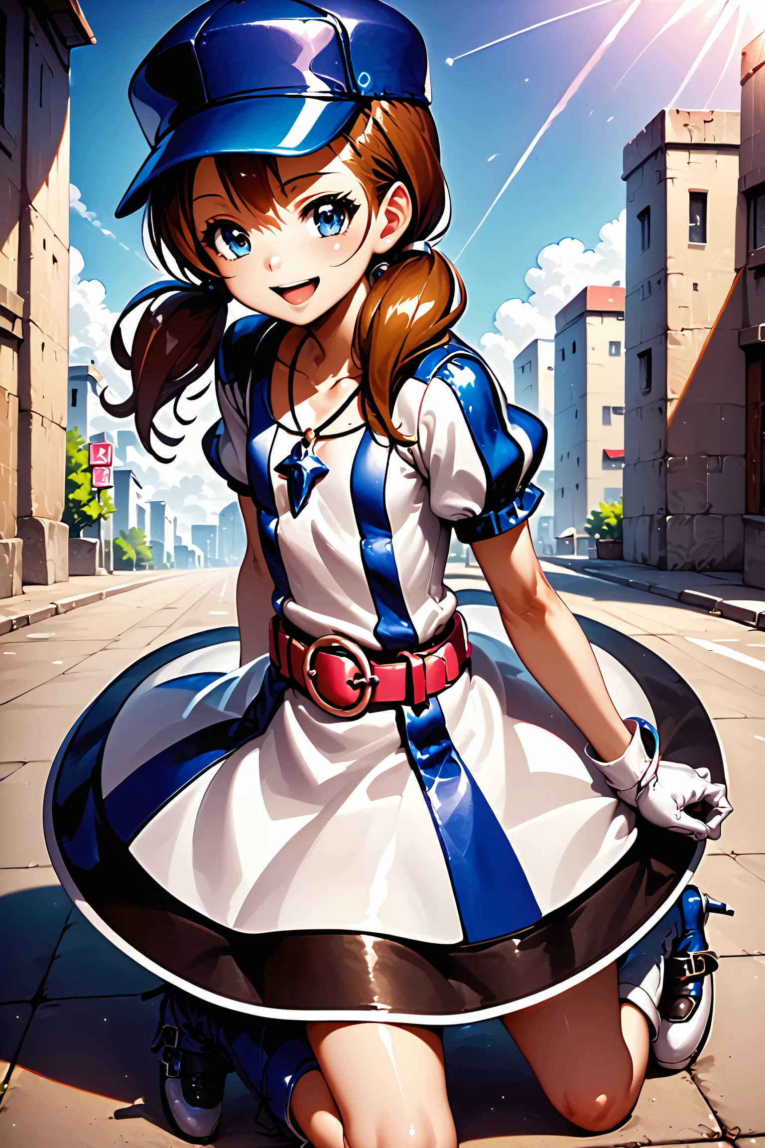 ai, 1girl, solo, gloves, hat, purple eyes, jewelry, boots, belt, brown hair, pendant, twintails, dress, necklace, baseball cap,