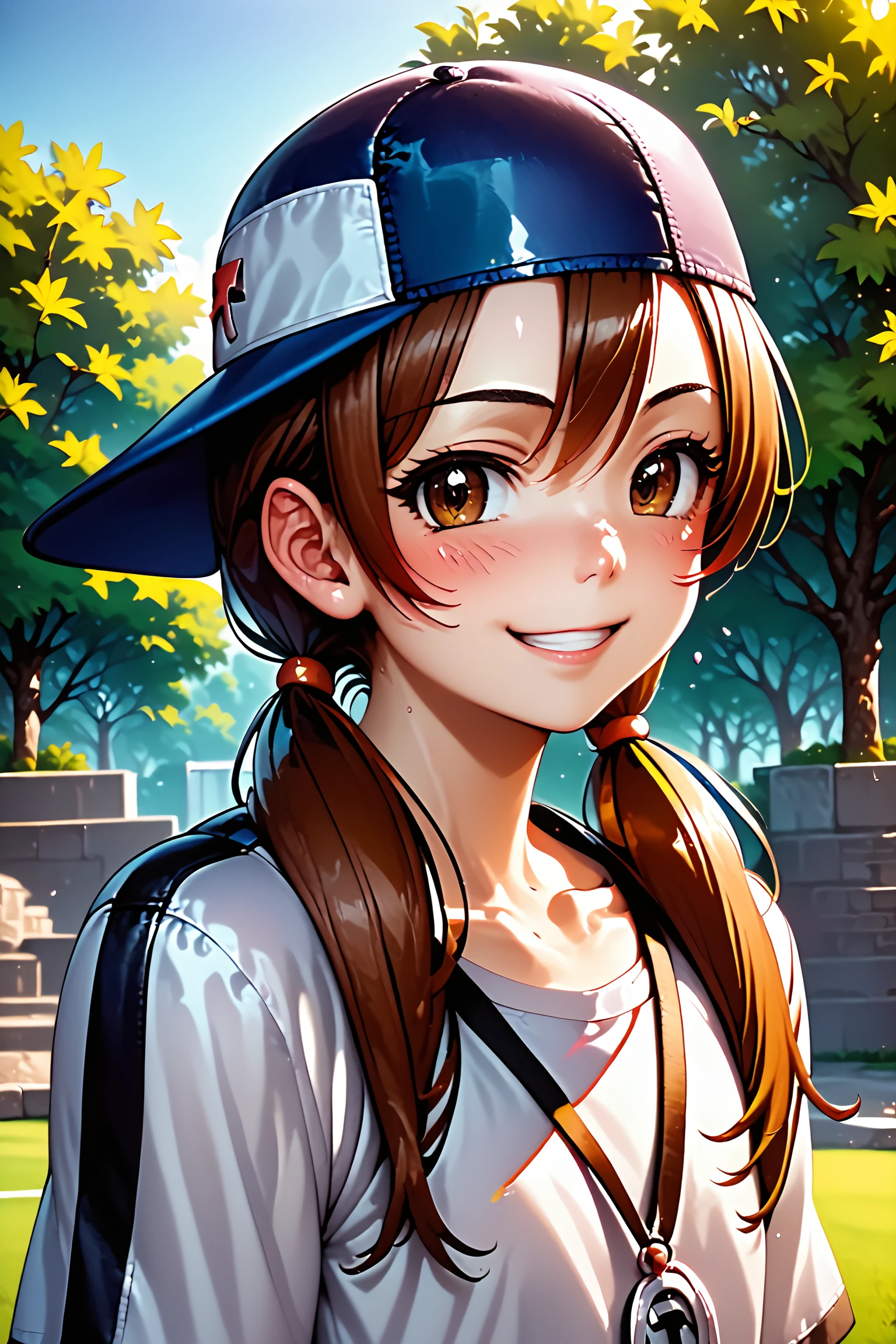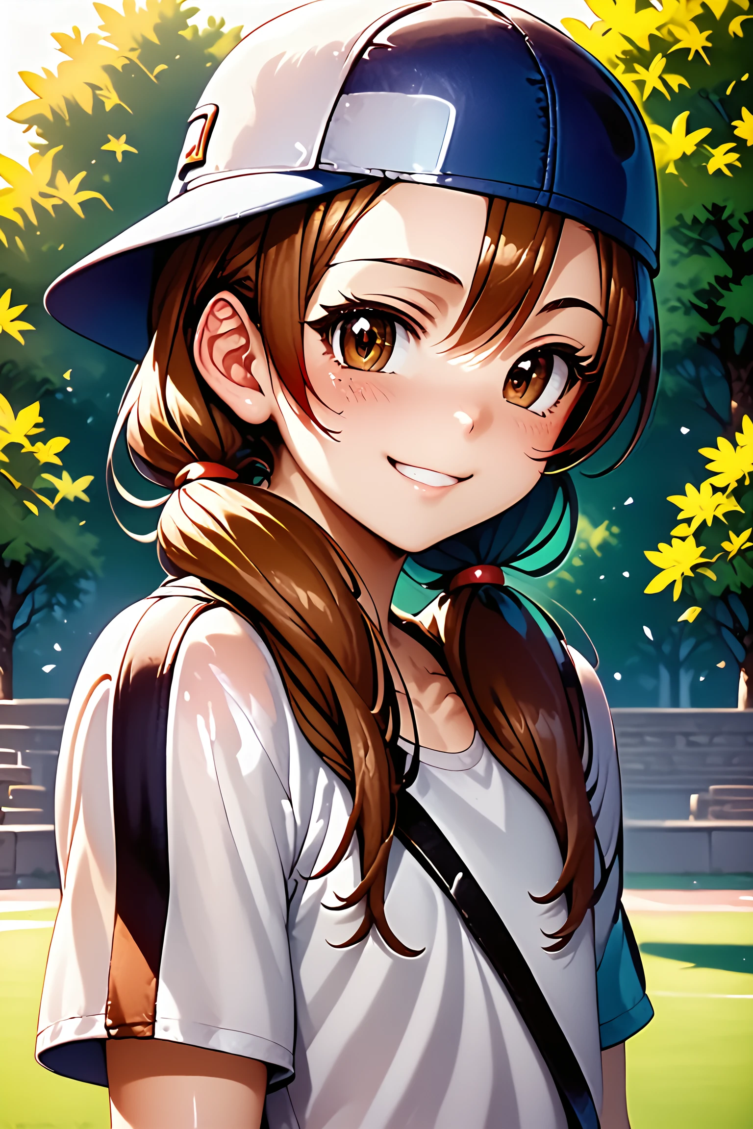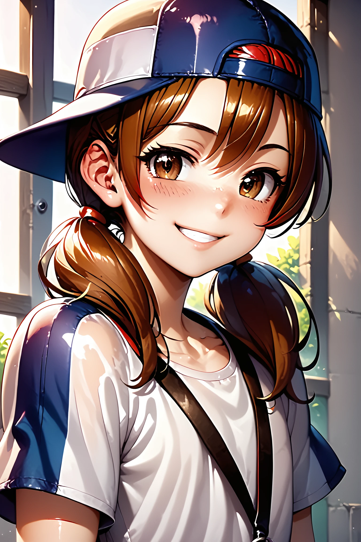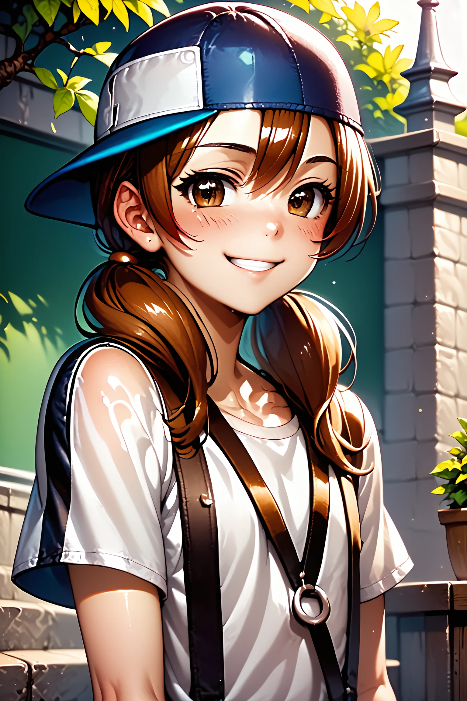 ai, 1girl, solo, gloves, hat, purple eyes, jewelry, boots, belt, brown hair, pendant, twintails, dress, necklace, baseball cap,