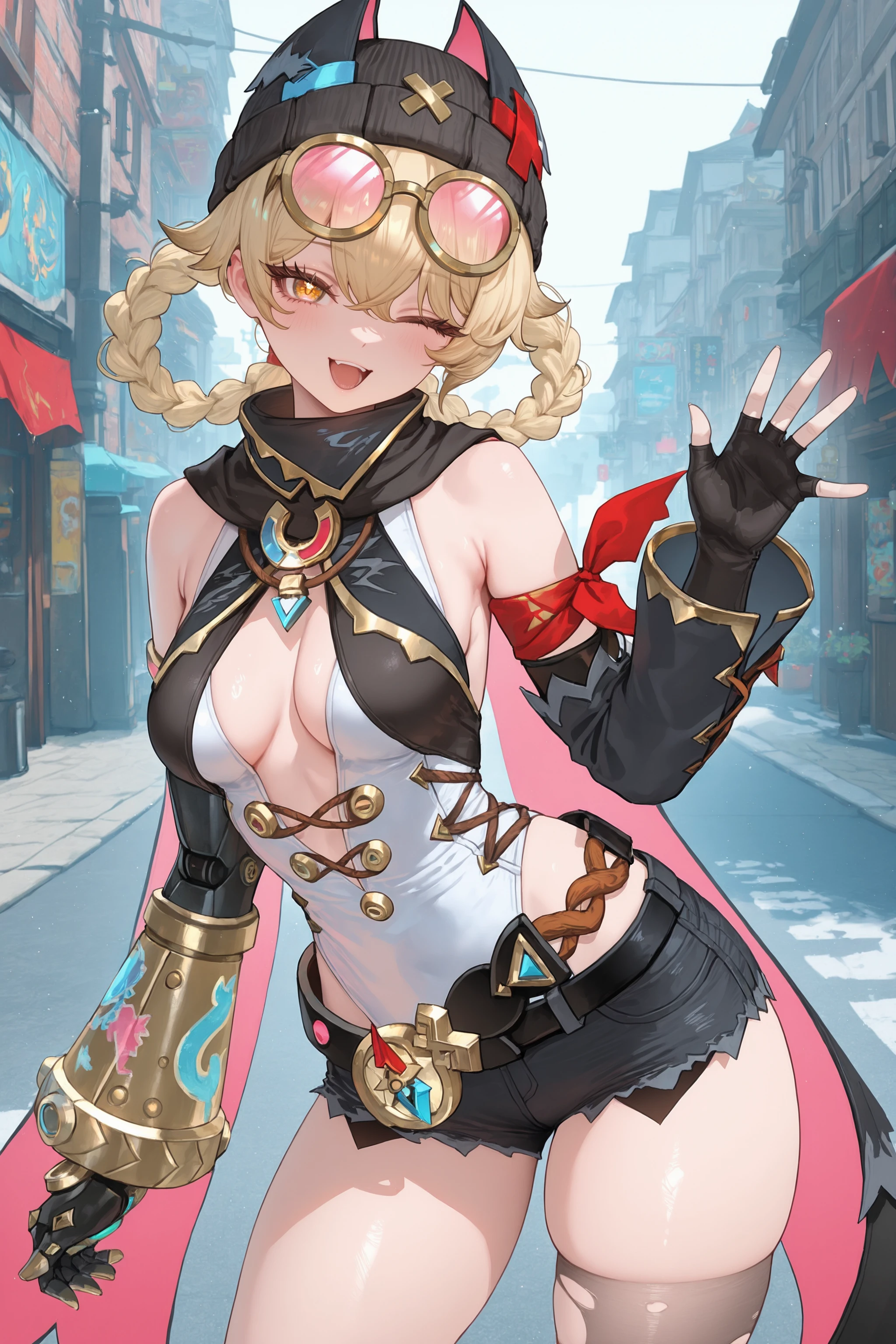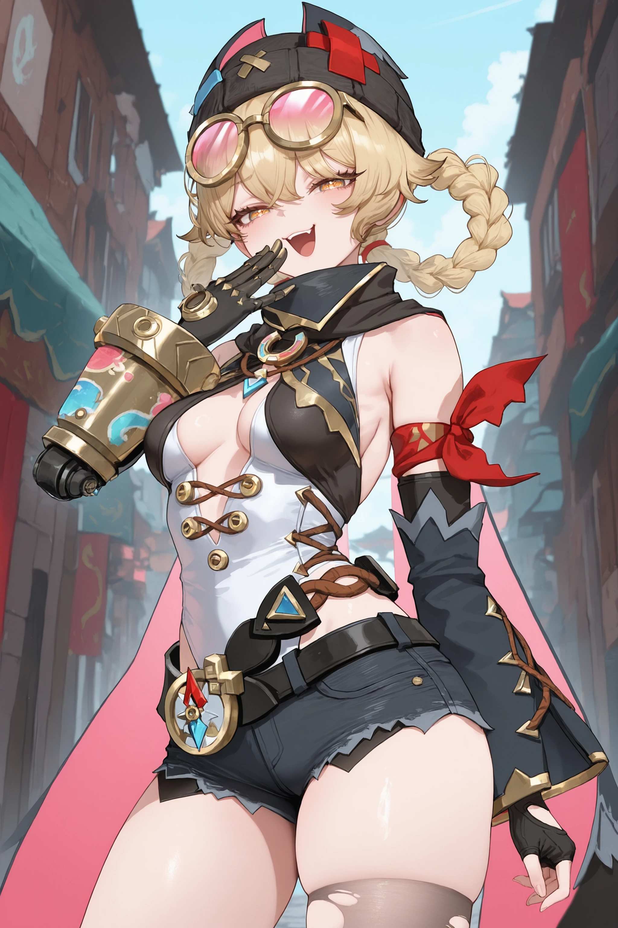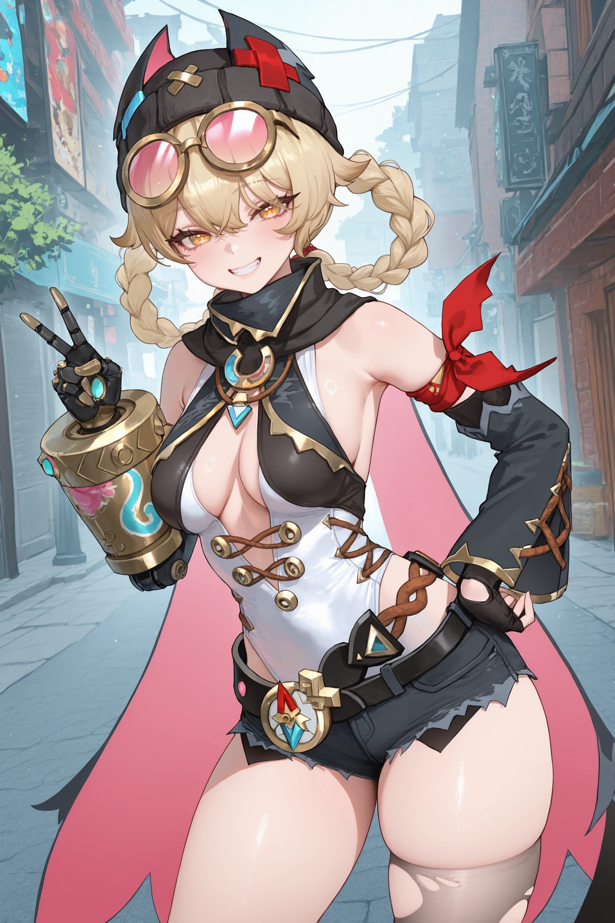 Additional prompts for her default costume, add/remove as you needed: braided hair rings, black beanie, goggles on head, collared cape, detached sleeves, single fingerless glove, single mechanical arm, arm ribbon, white leotard, utility belt, black micro shorts, torn single thighhigh, red single sock, single leg warmer, black platform boots