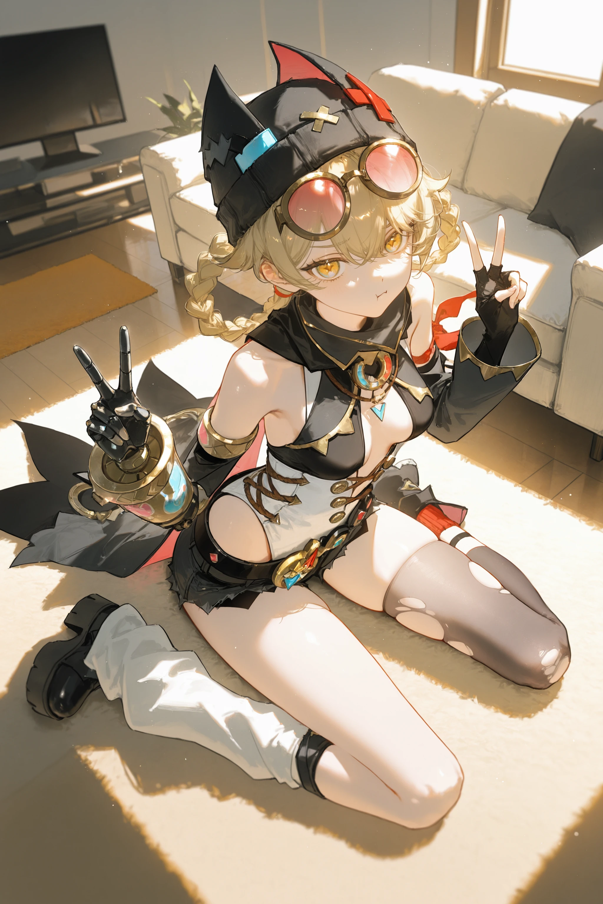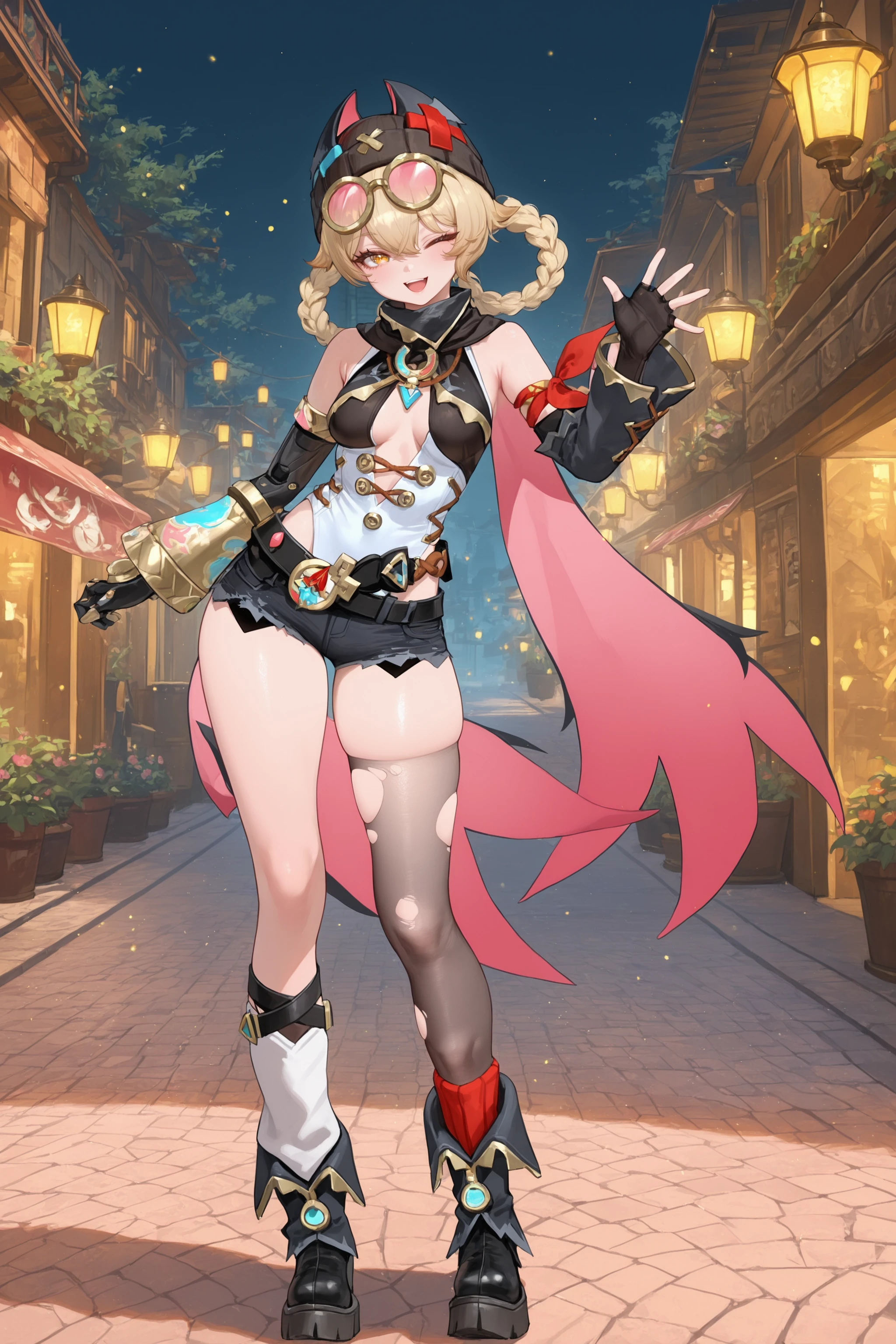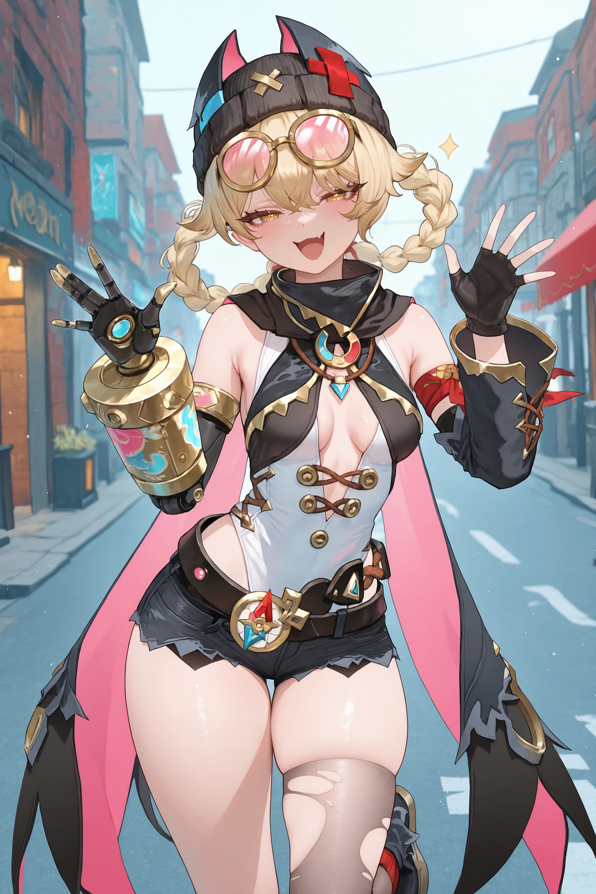 Additional prompts for her default costume, add/remove as you needed: braided hair rings, black beanie, goggles on head, collared cape, detached sleeves, single fingerless glove, single mechanical arm, arm ribbon, white leotard, utility belt, black micro shorts, torn single thighhigh, red single sock, single leg warmer, black platform boots