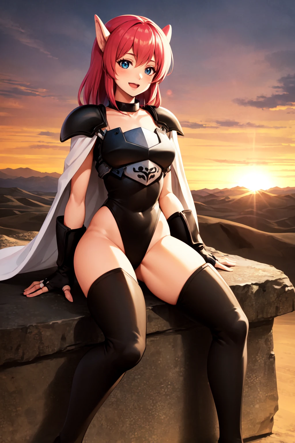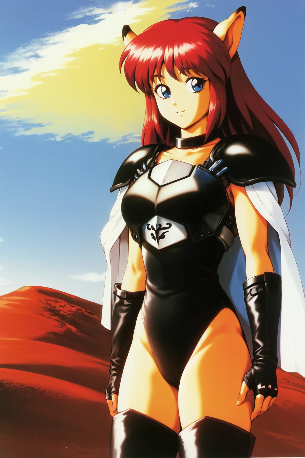 animal ears, cape, choker, shoulder armor, leotard, breastplate, elbow gloves, fingerless gloves, thigh boots