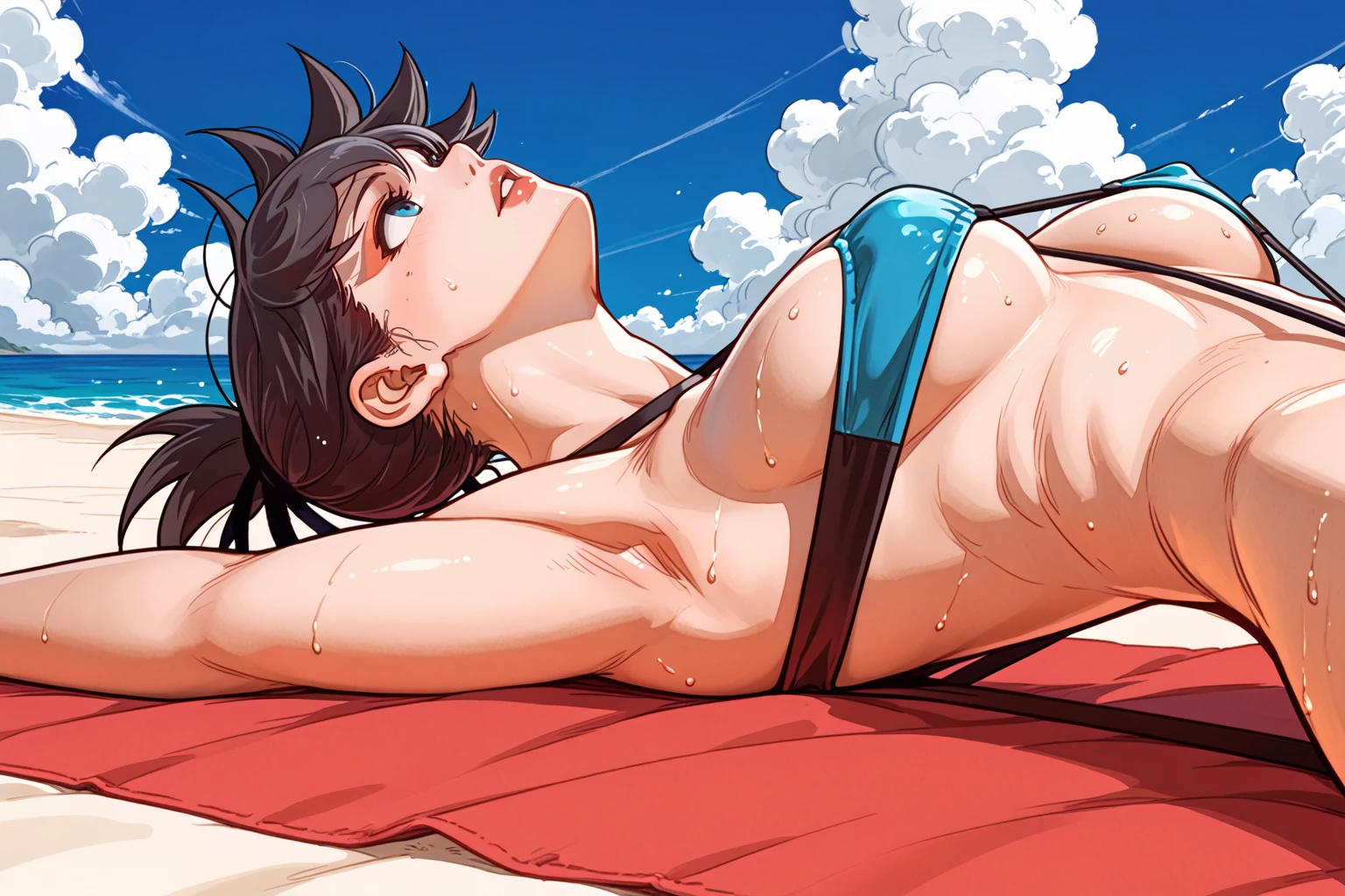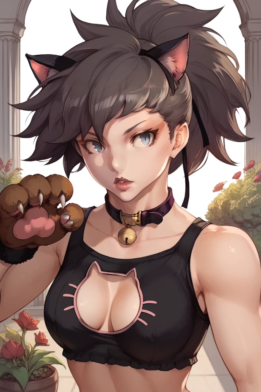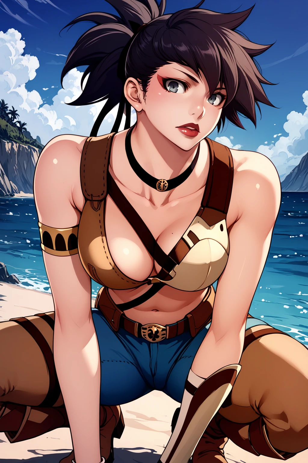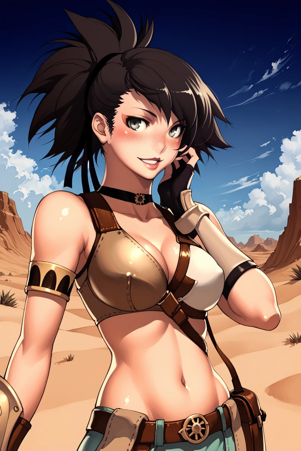 Trigger : 1girl, short hair, ponytail, armlet, top, choker, blue brown pants, belt, fingerless gloves, midriff