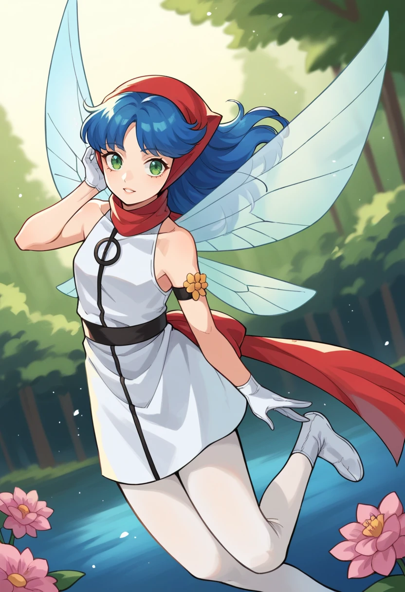 pixieds, green eyes, blue hair, long hair, bandana, scarf, white dress, white pantyhose, fairy wings, white gloves, armlet