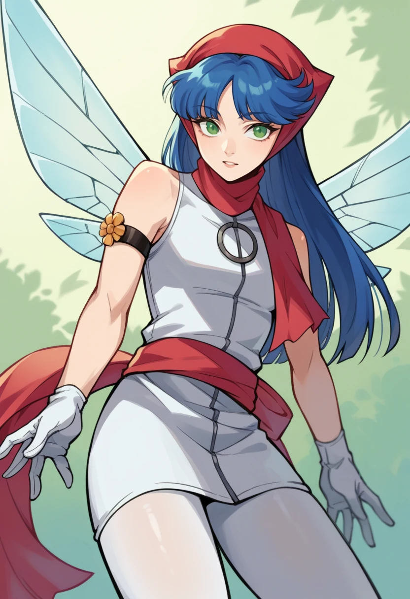 Tags: pixieds, green eyes, blue hair, long hair, bandana, scarf, white dress, white pantyhose, fairy wings, white gloves, armlet