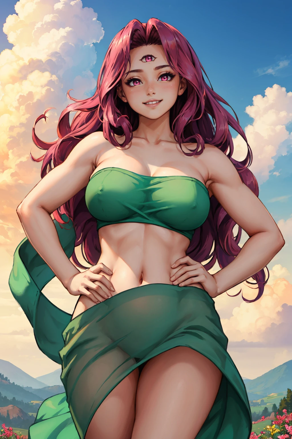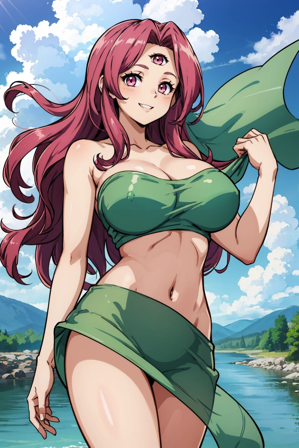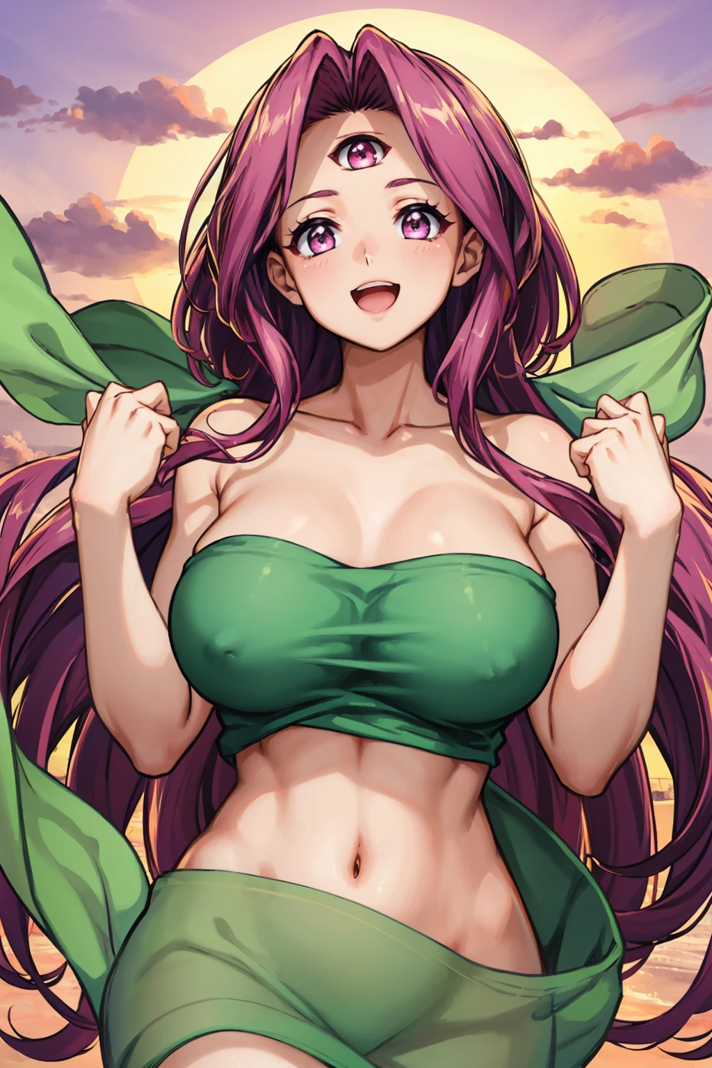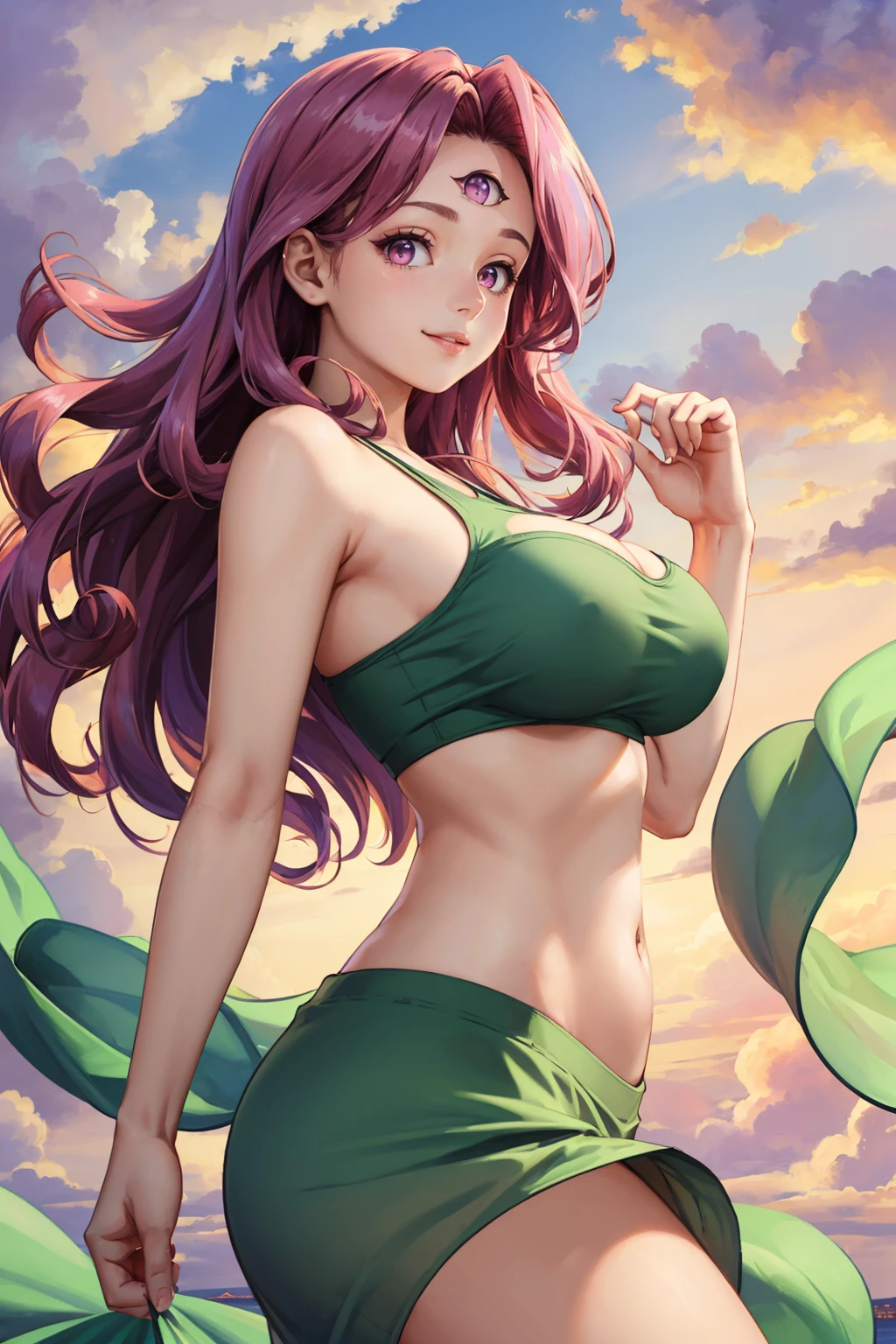Add "long hair, green sash, convenient censoring, midriff" for her typical look.