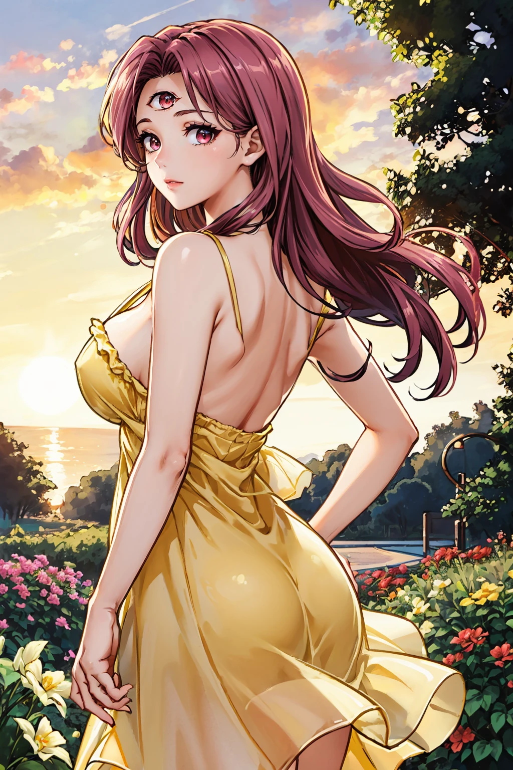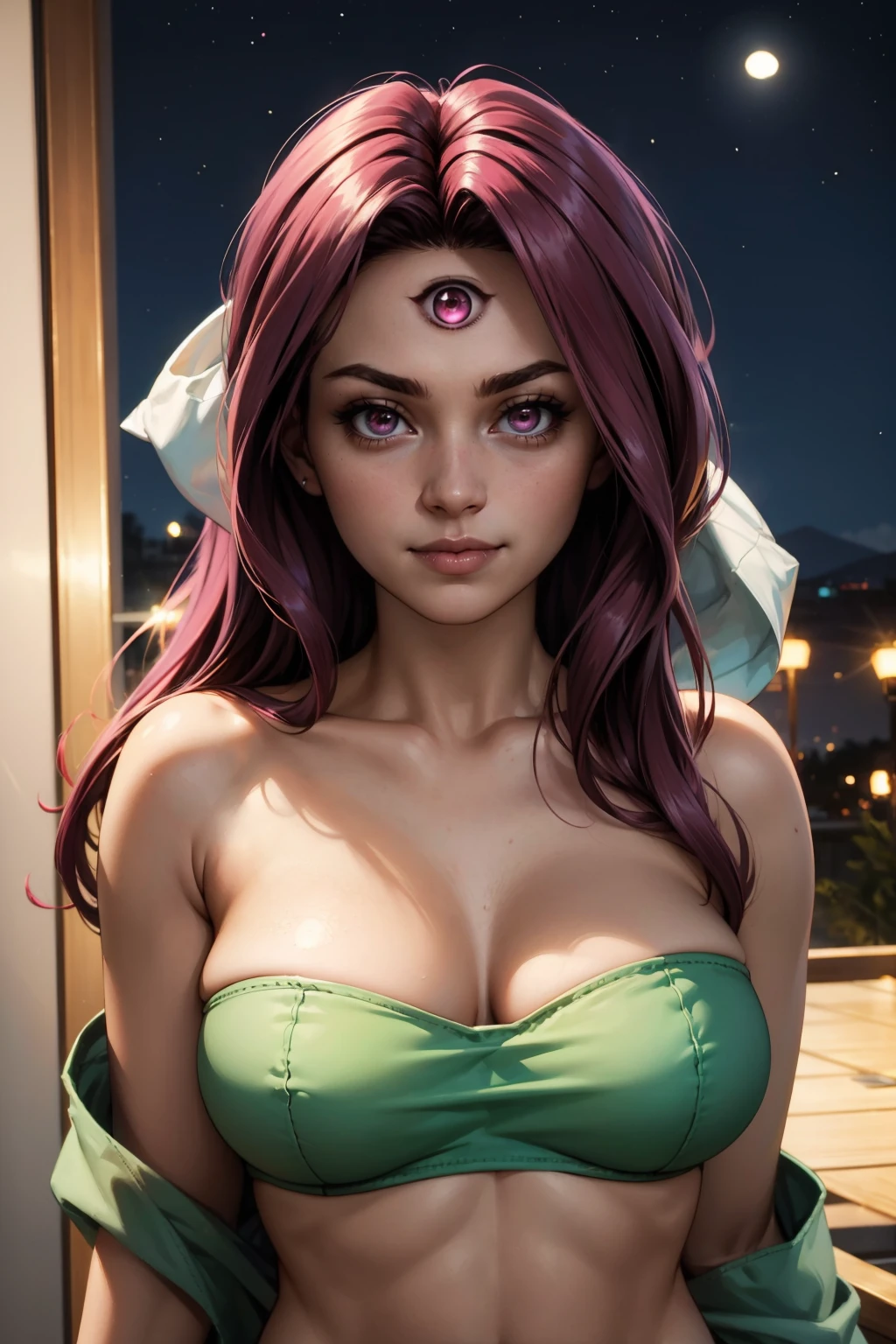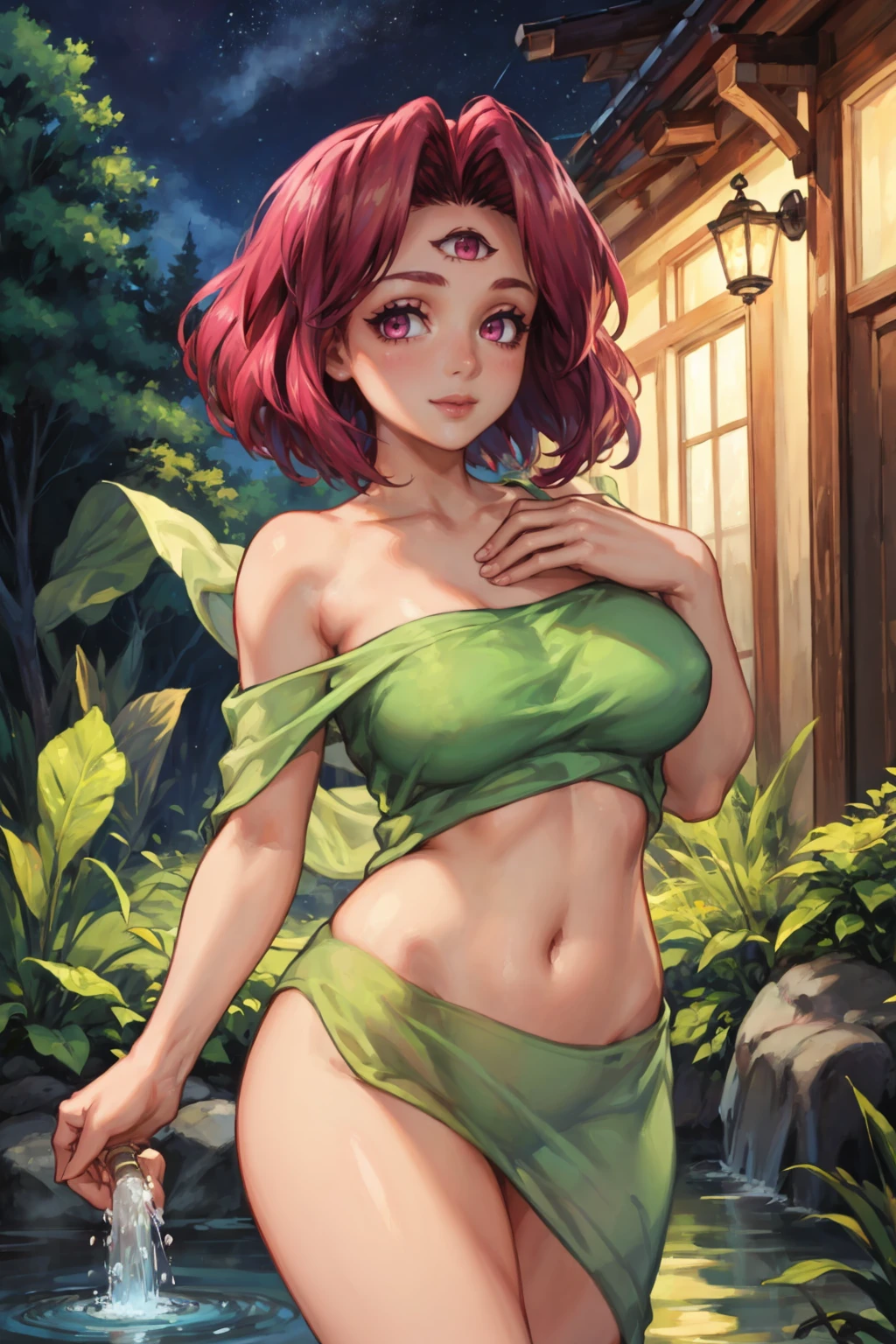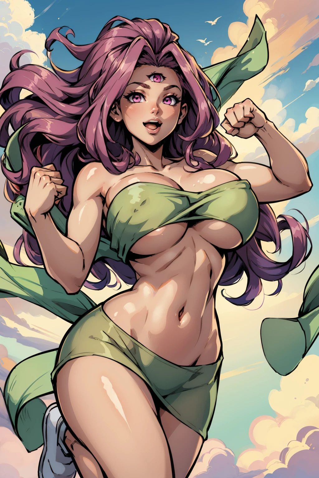 Add "long hair, green sash, convenient censoring, midriff" for her typical look.