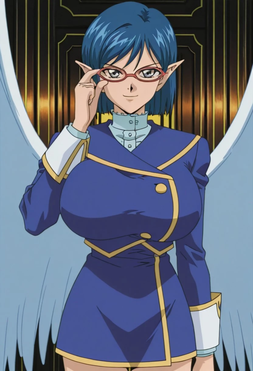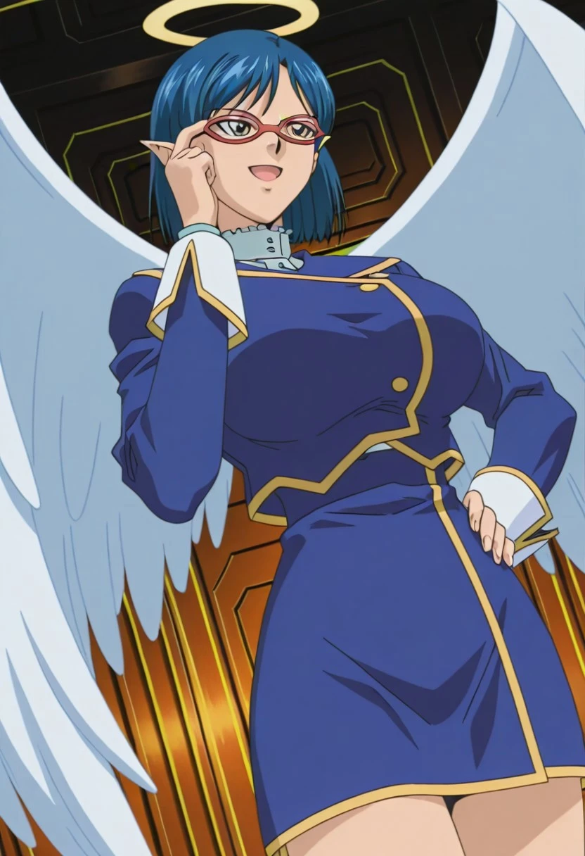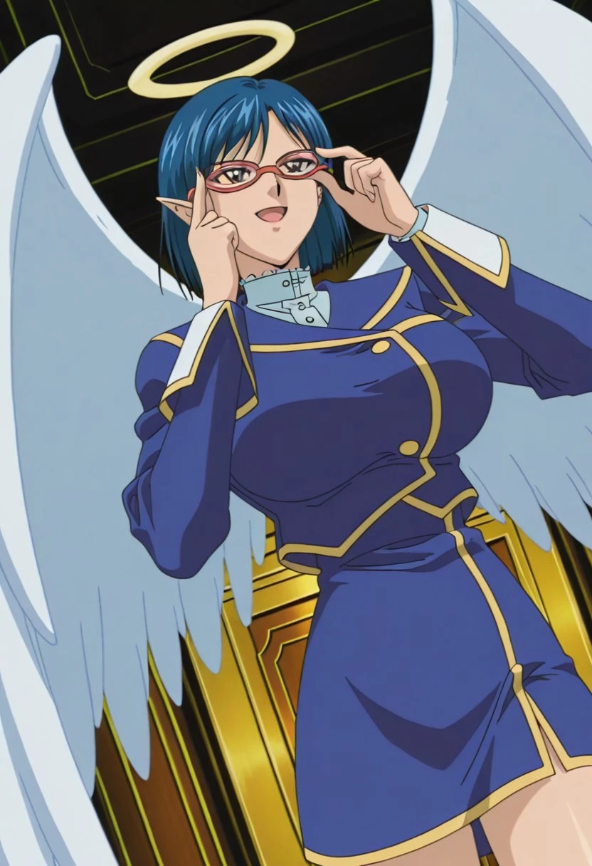 Hysteric_Angel,pointy ears,short hair,blue hair,glasses,adjusting eyewear,blue long-sleeve uniform mini dress with gold trim,pencil skirt,kneehighs,high heels,angel wings,halo,