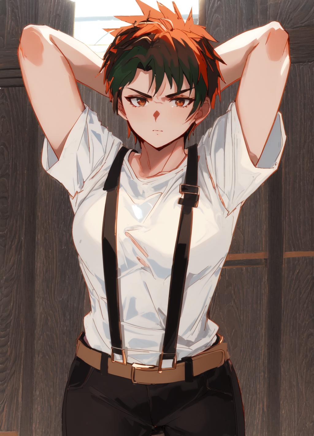Additional prompts for her clothing can be black coat, brown belt, brown suspenders, black pants, white shirt and additionally sunglasses for her sunglasses look.